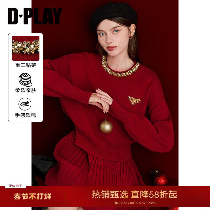 📚 DPLAY新年红色毛衣套装亮钻上衣含羊毛针织衫女冬季圆领宽松毛衣