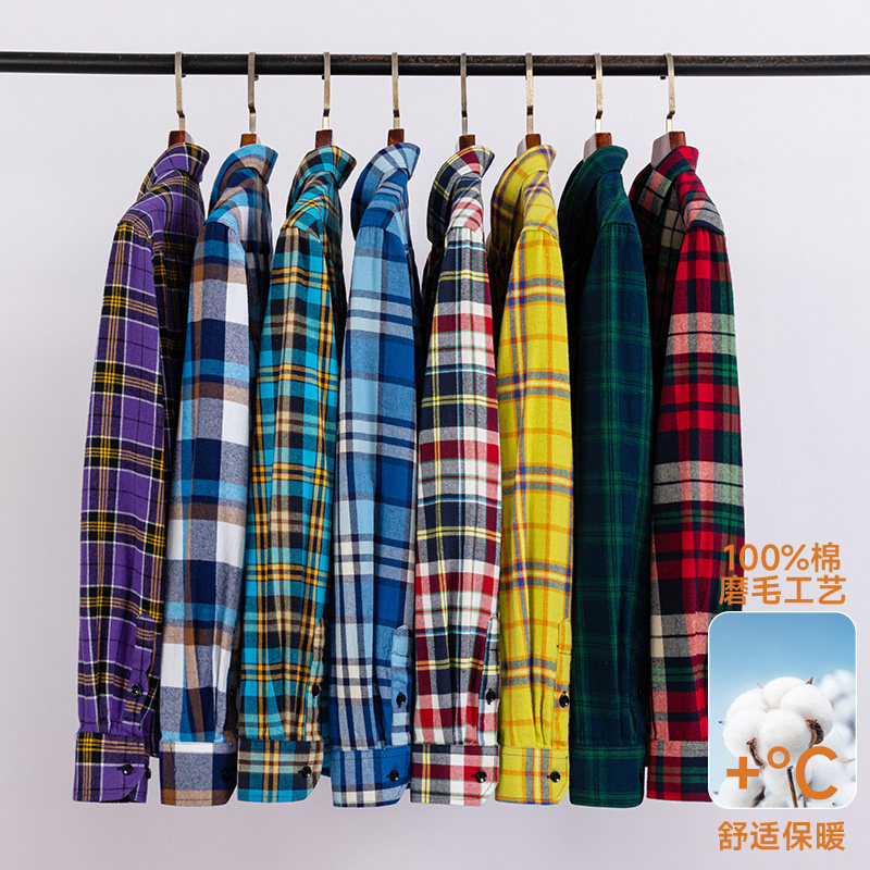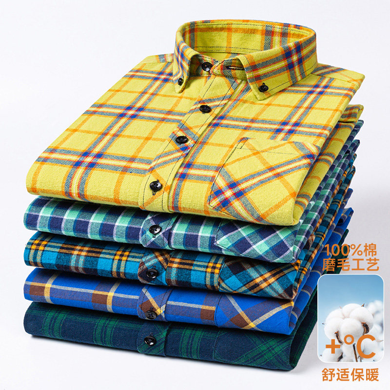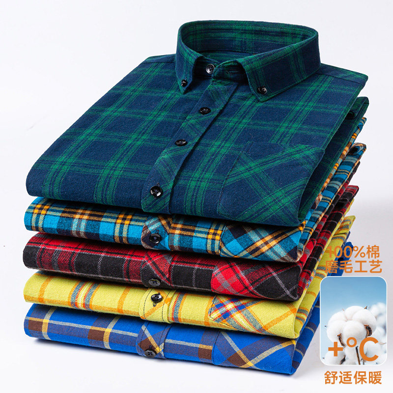 📚 100%全棉磨毛春秋新款纯棉长袖衬衫中青年休闲大码格子外套衬衣男