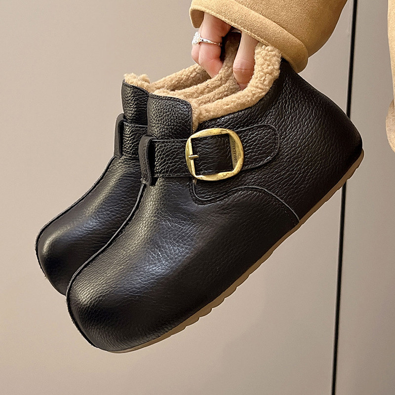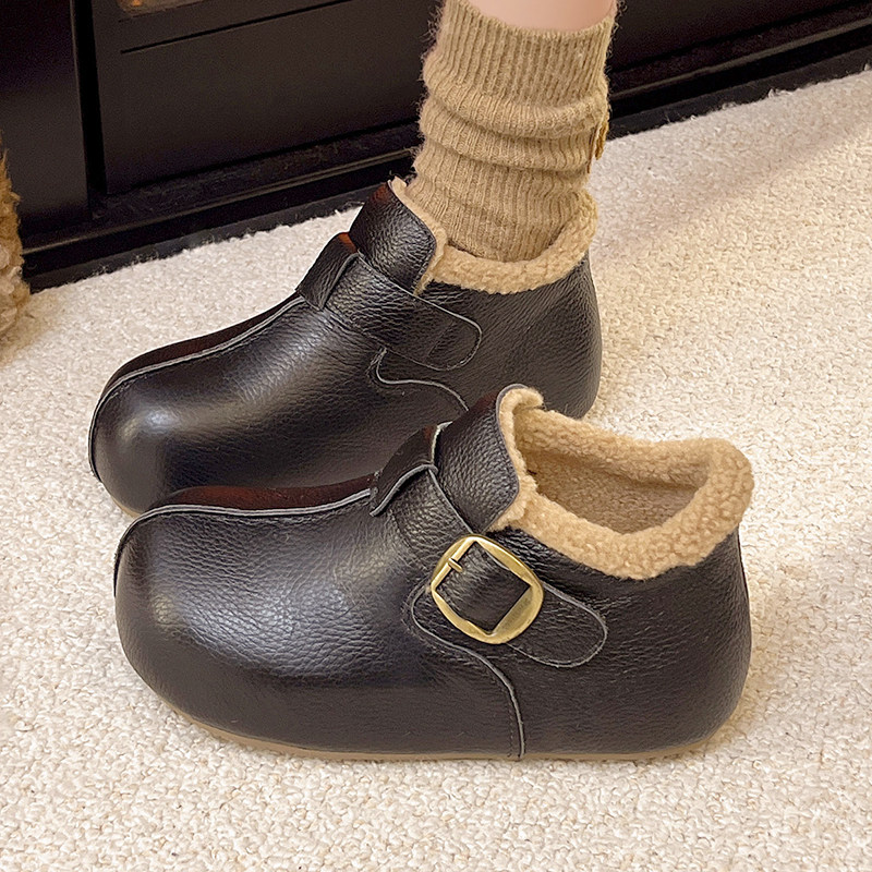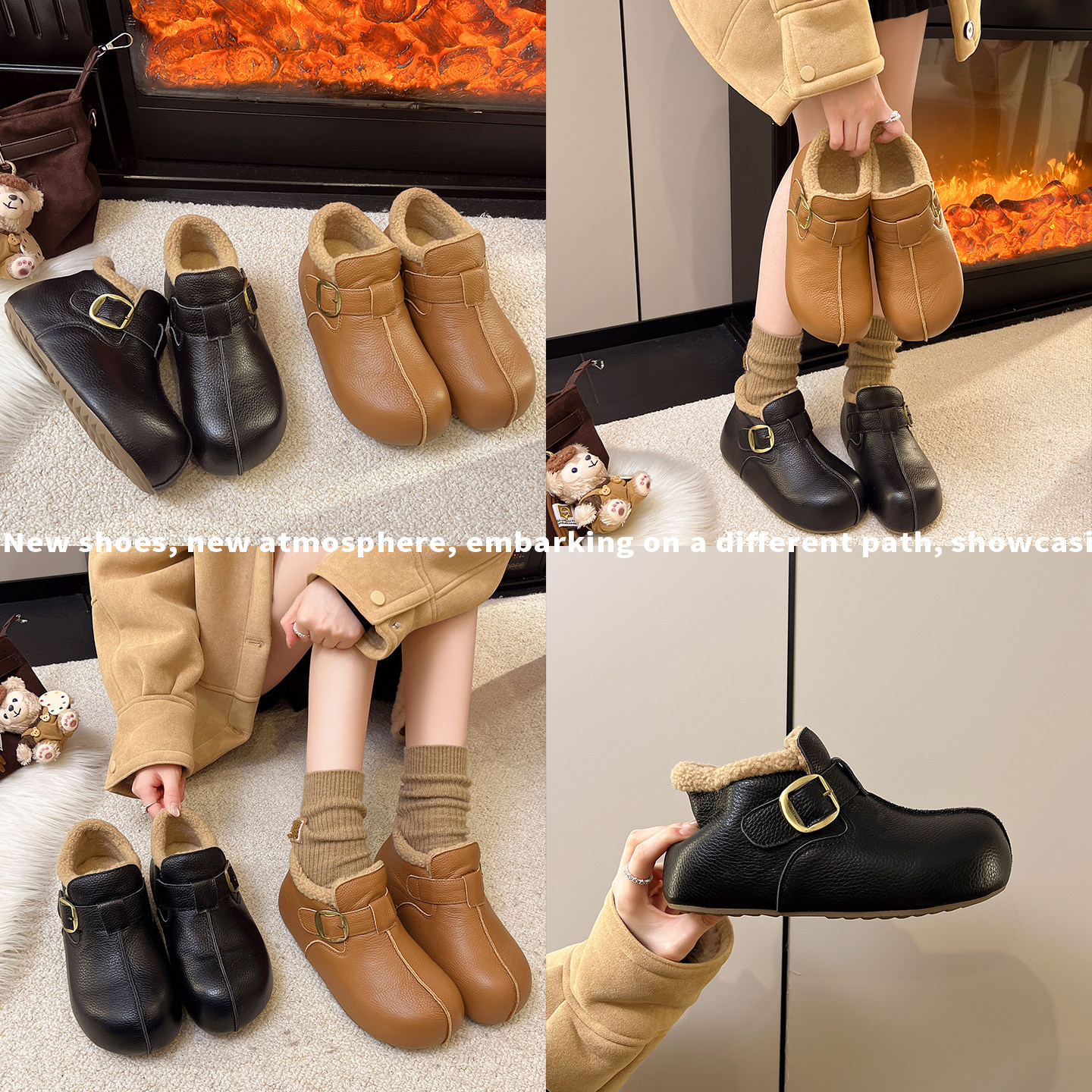 📚 头层牛皮一脚蹬乐福加绒羊羔毛棉鞋大头全包小个子内增高博肯鞋女