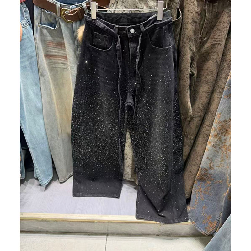 📚 满天星烫钻重工牛仔裤女大码冬季加绒设计感显瘦带钻爆闪阔腿裤子