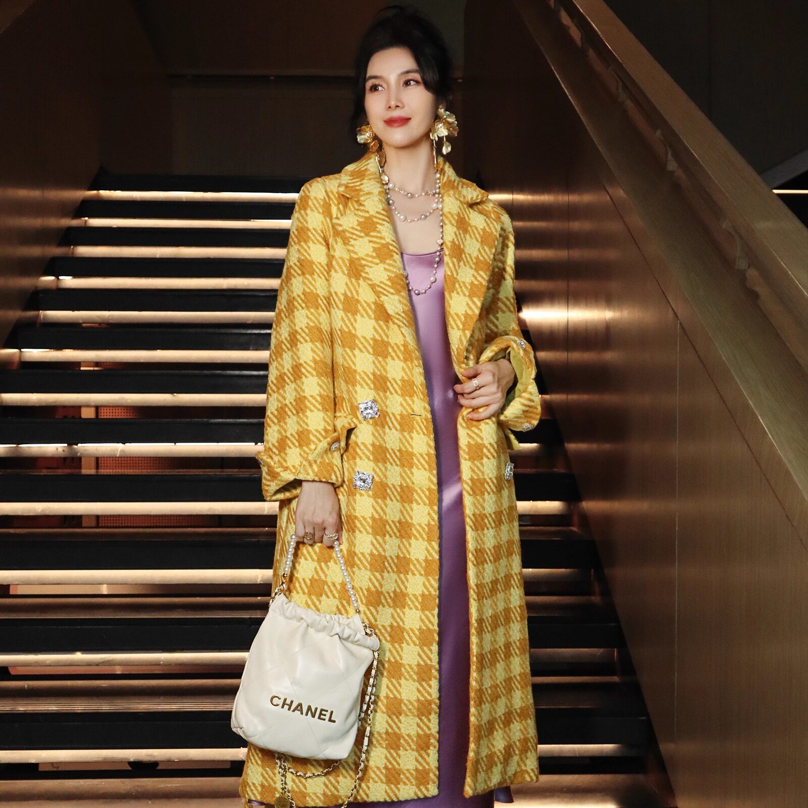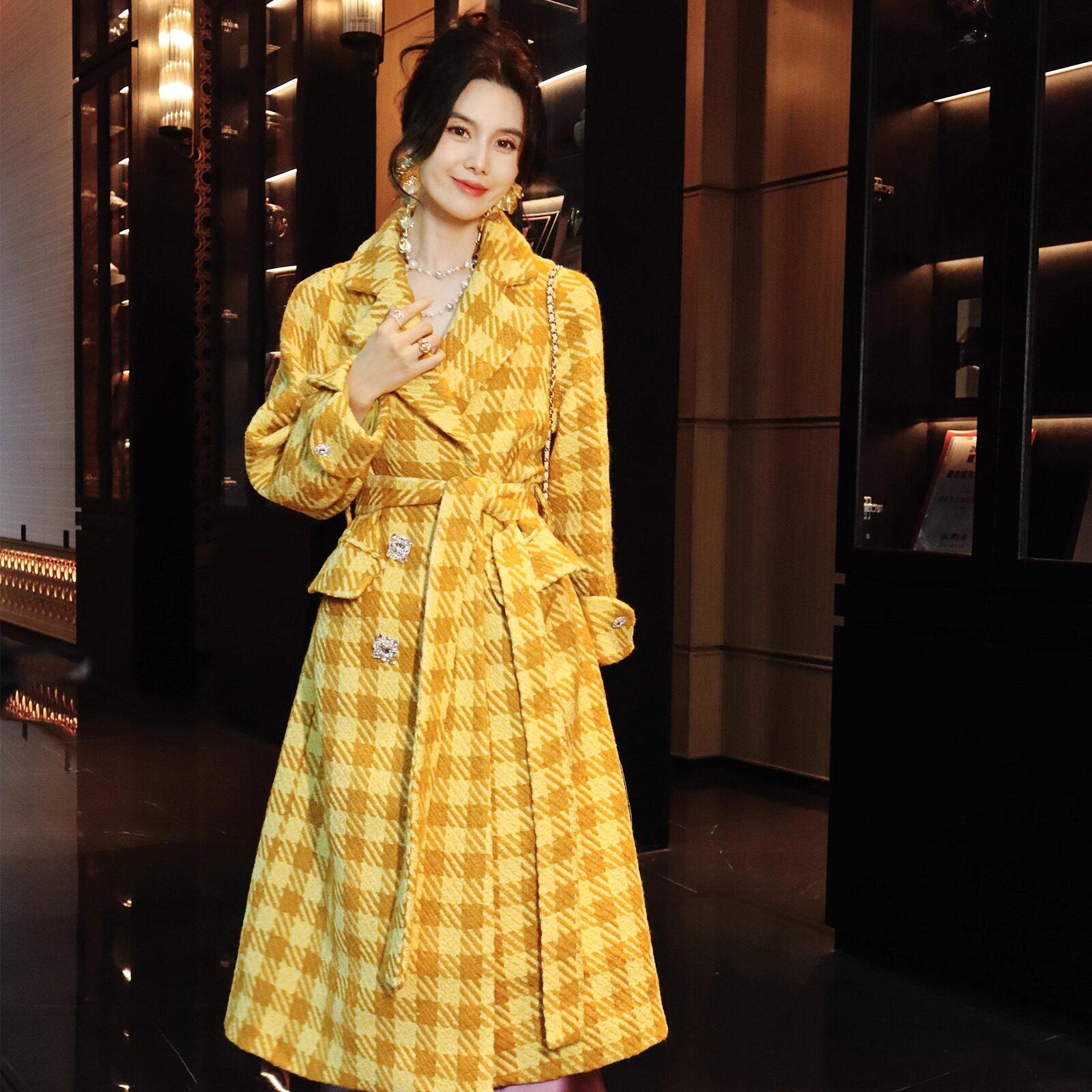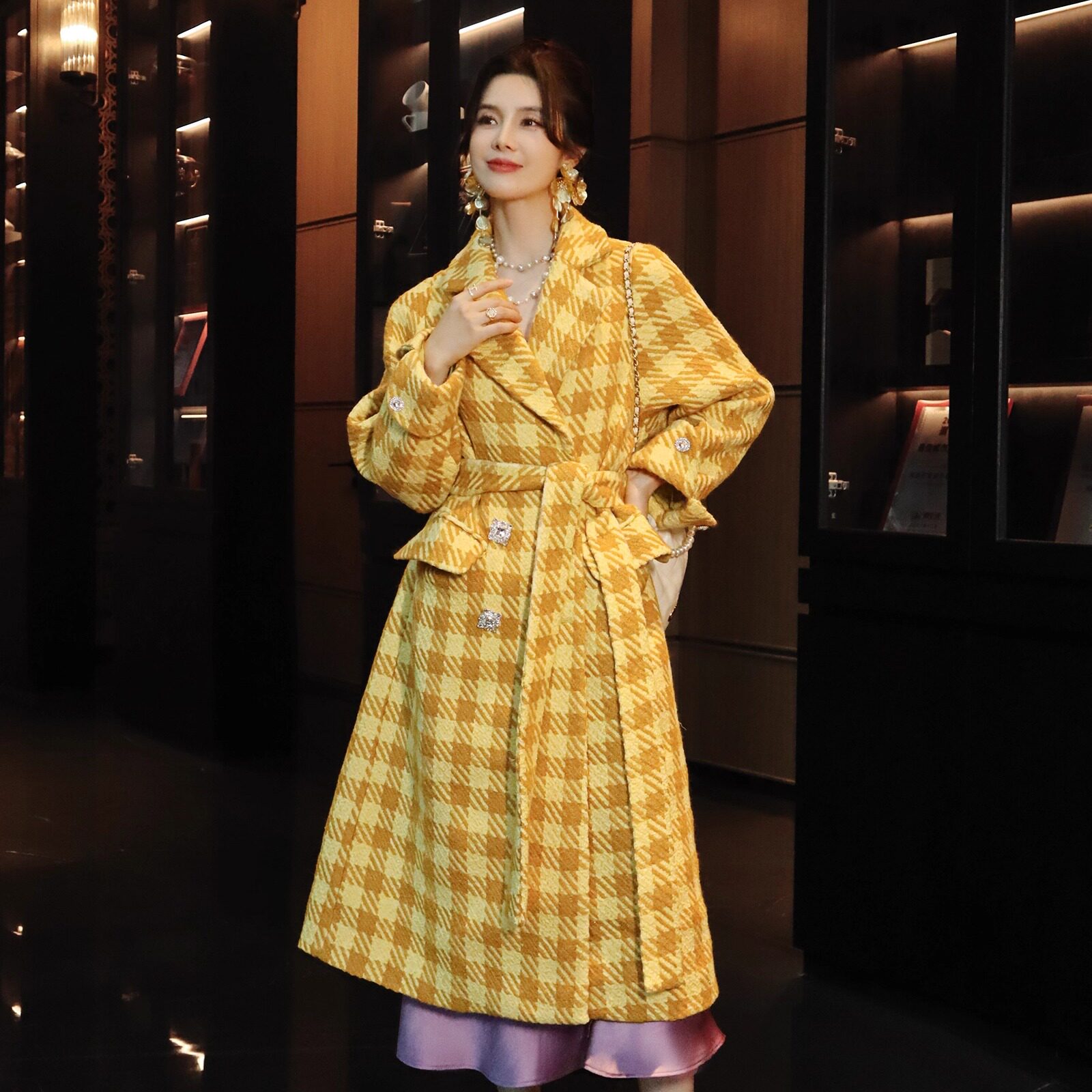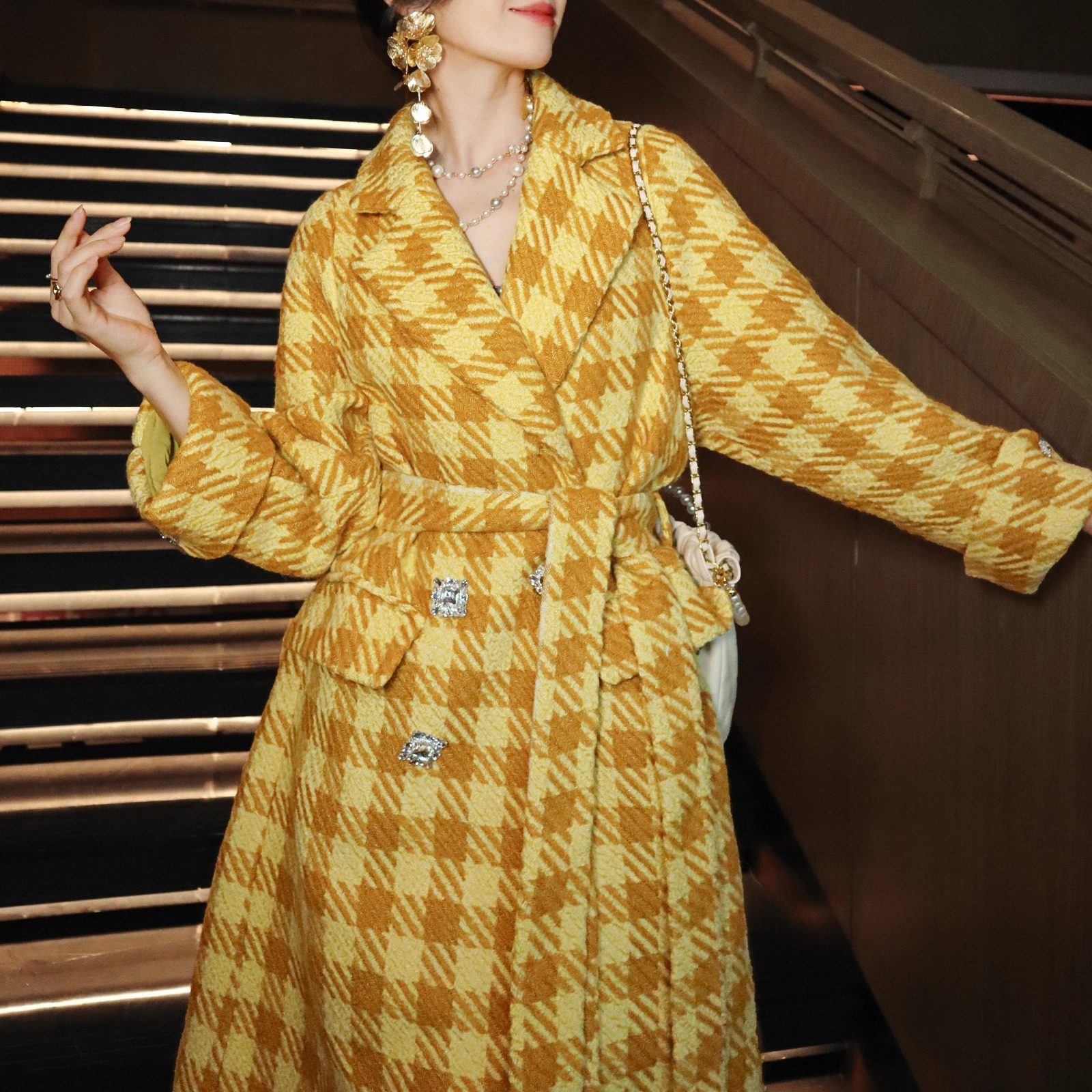 📚 鹅黄色千鸟格高级羊毛亮丝粗毛呢法式轻奢系带收腰双排扣长款大衣