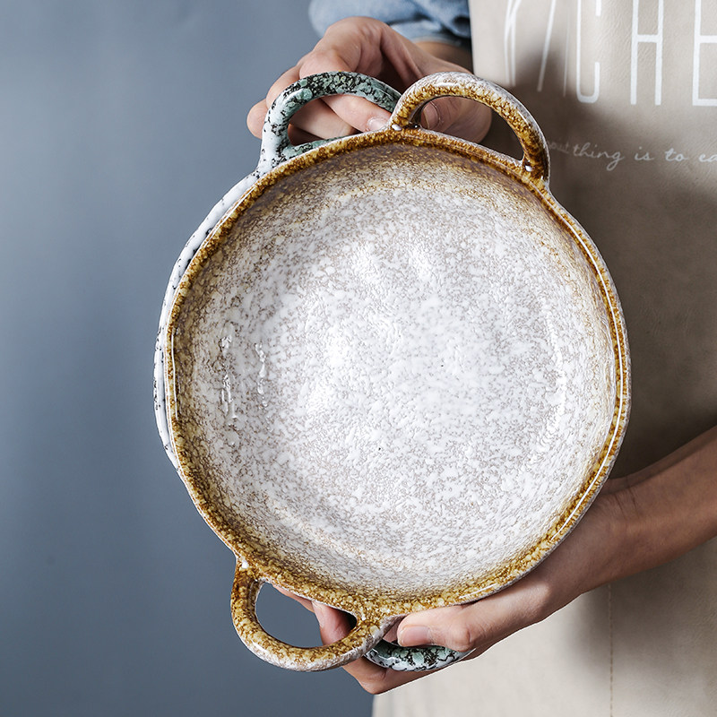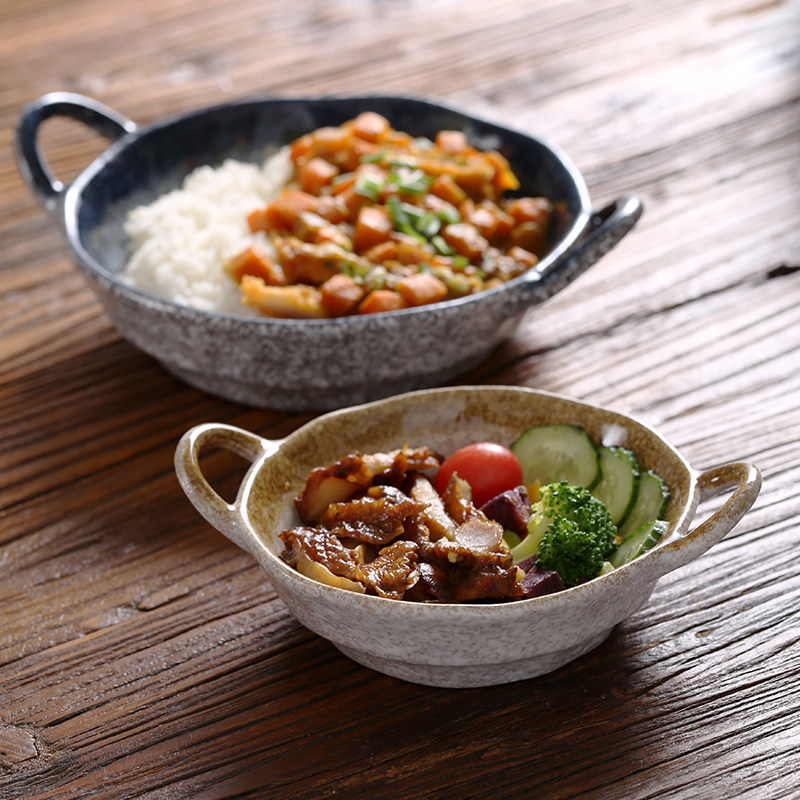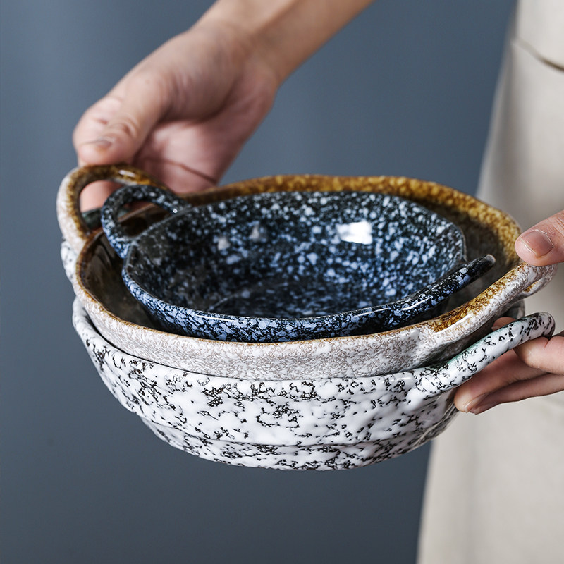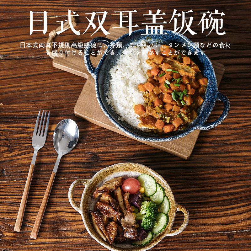 📚 日式复古防烫手捏不规则双耳碗陶瓷餐具饭碗沙拉水果碗拉面碗汤碗