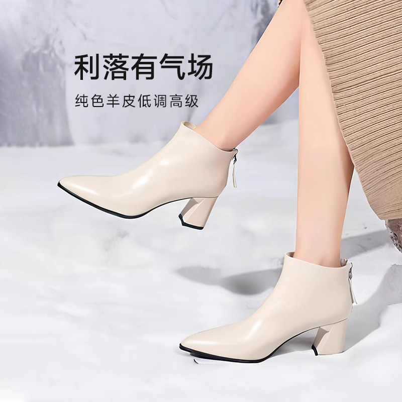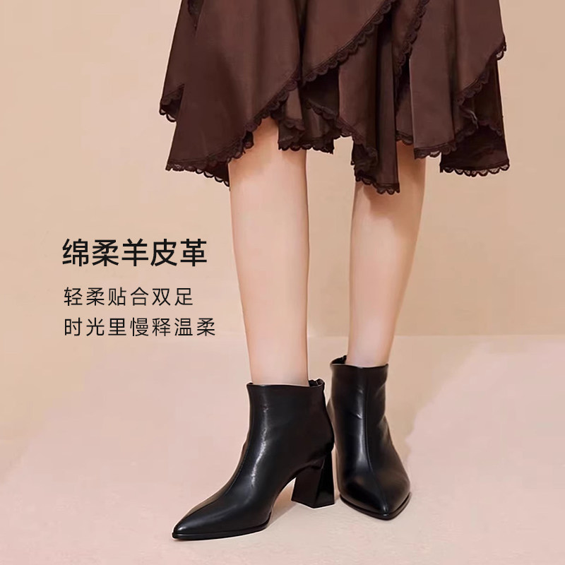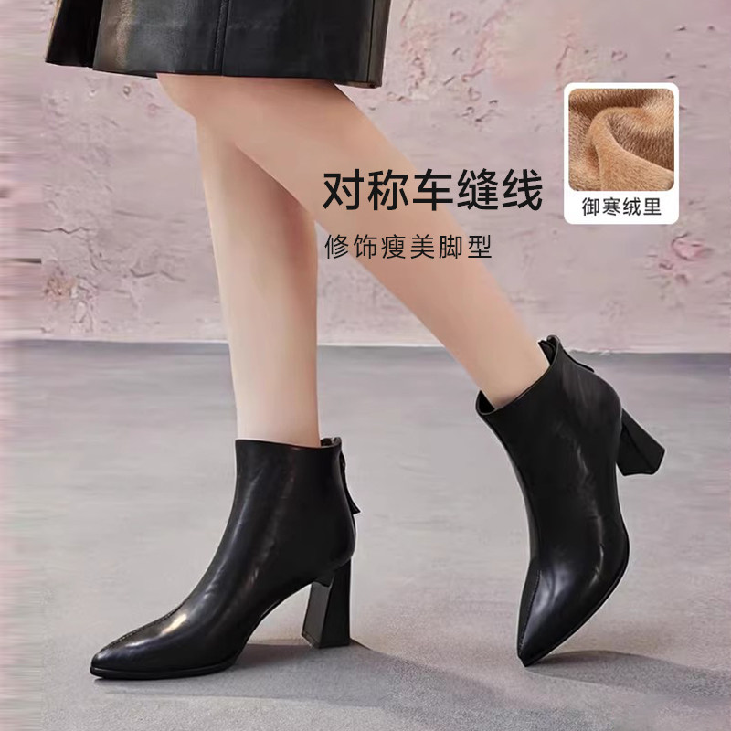 📚 红粉知己2025冬季复古加绒真皮尖头优雅粗高跟女短靴7.5CM时装靴