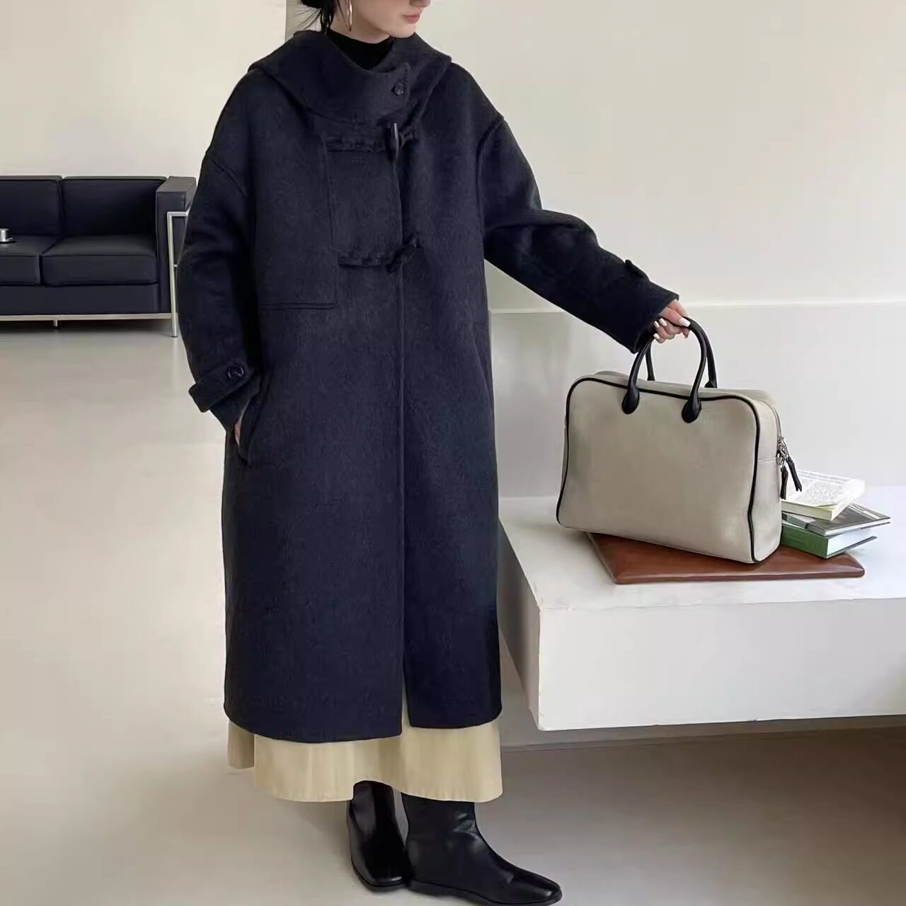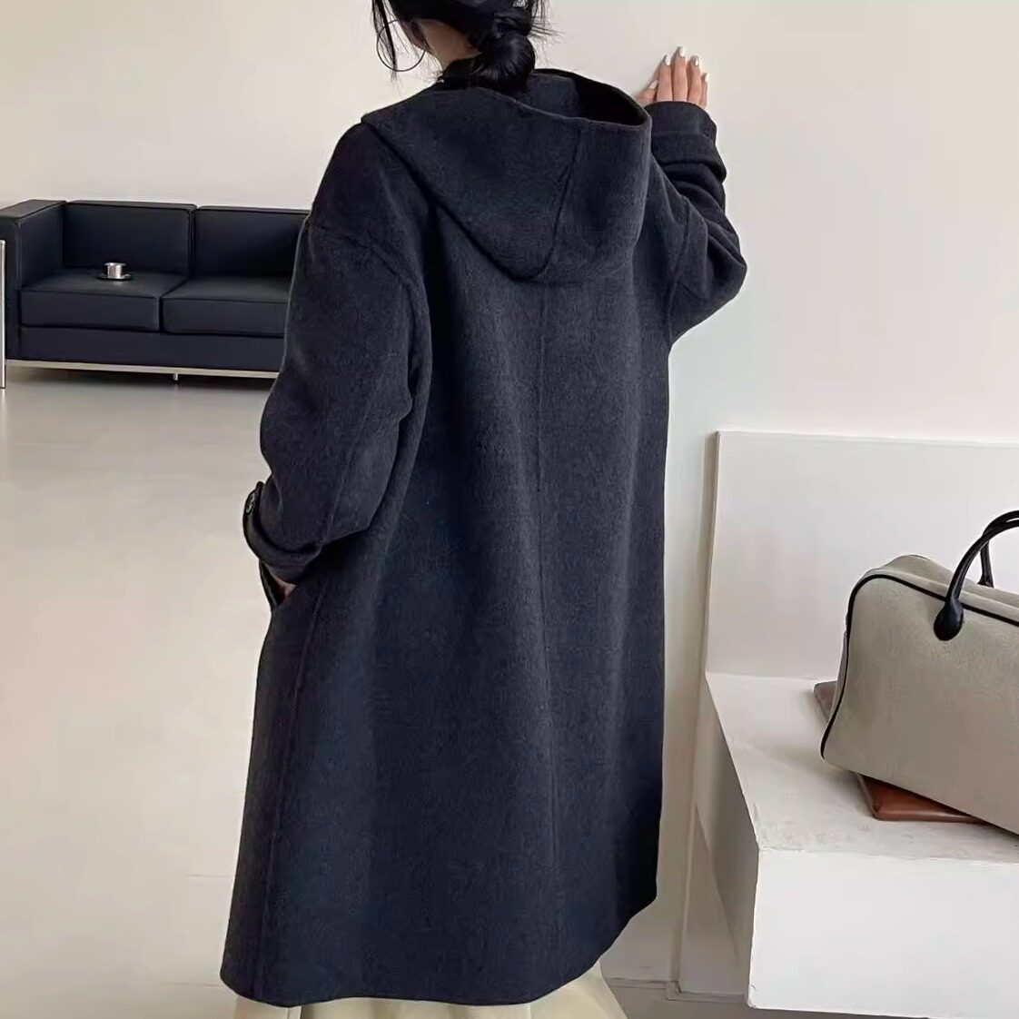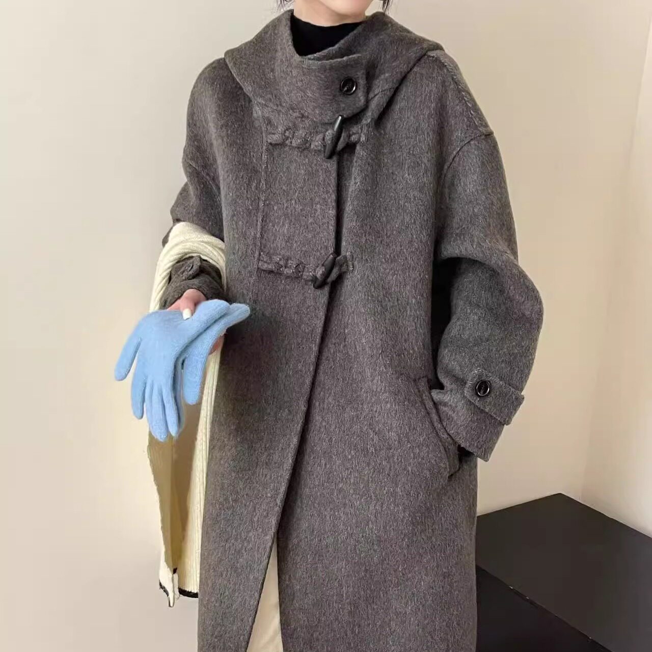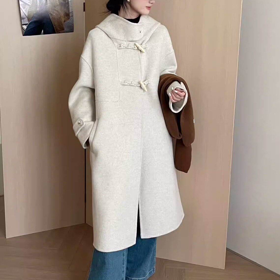📚 韩系连帽双面羊绒大衣女秋冬新款牛角扣小个子中长款羊毛呢外套女
