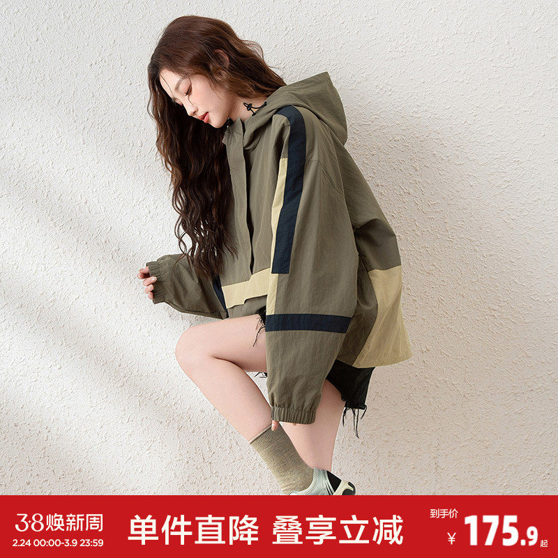 📚 唐狮早春新款外套女连帽工装港风上衣chic撞色冲锋少年休闲k