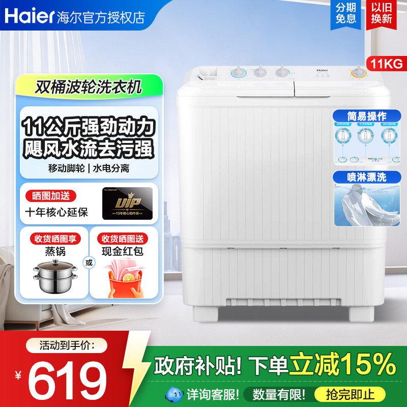 📚 海尔10/11kg波轮洗衣机双缸双桶大容量15公斤双筒半自动老式家用