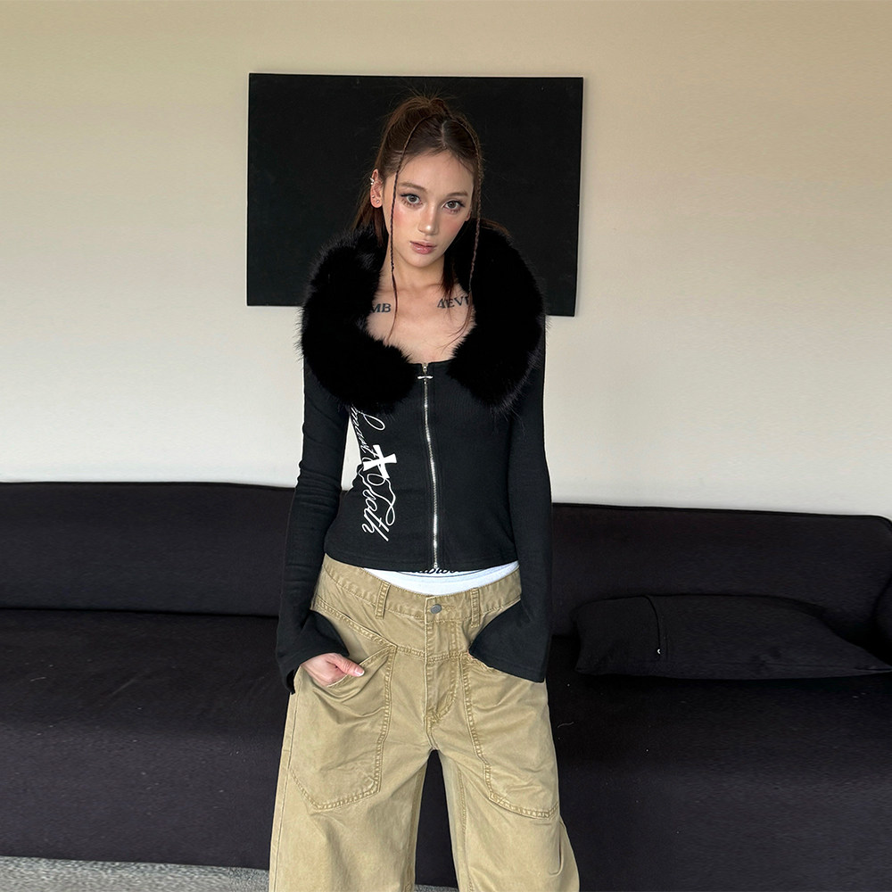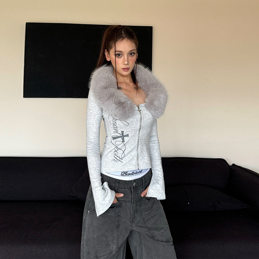 📚 辣到中暑秋冬辣妹可拆卸毛领拼接V领拉链长袖T恤修身开衫性感上衣