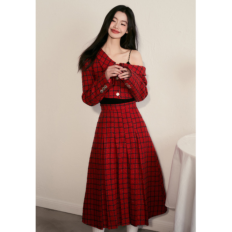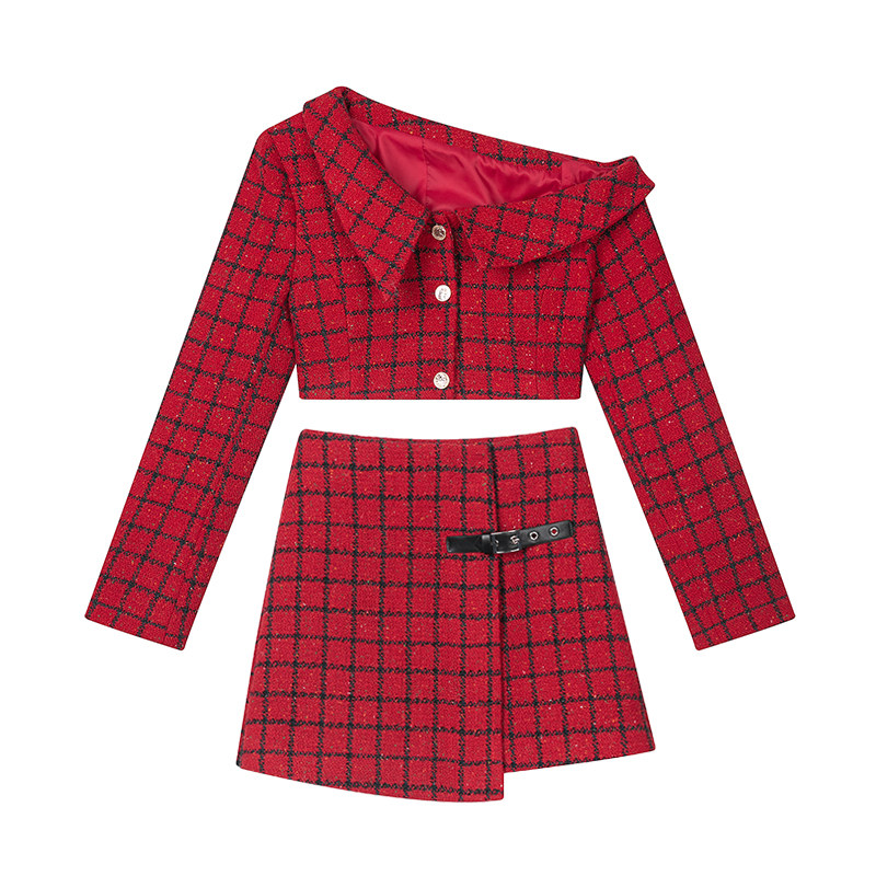 📚 1P STUDIO【限时清仓 5折秒杀】红色格子不规则外套半裙两件套装