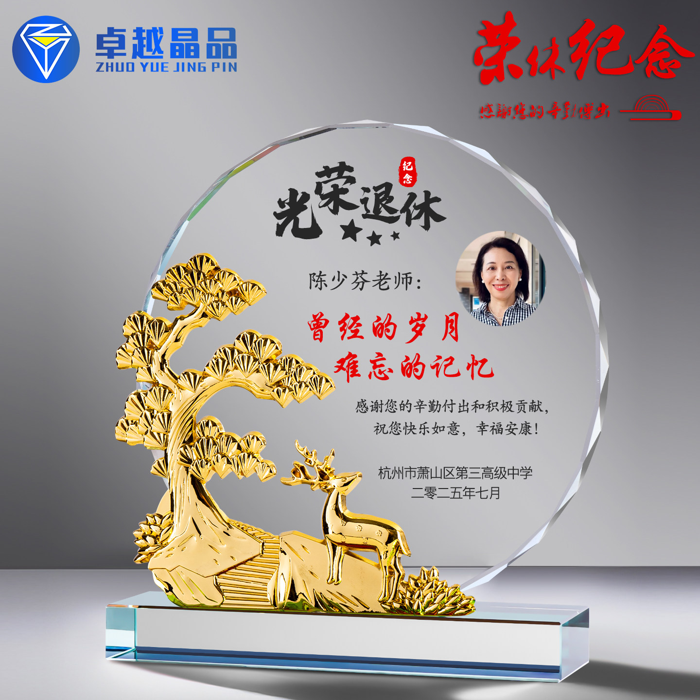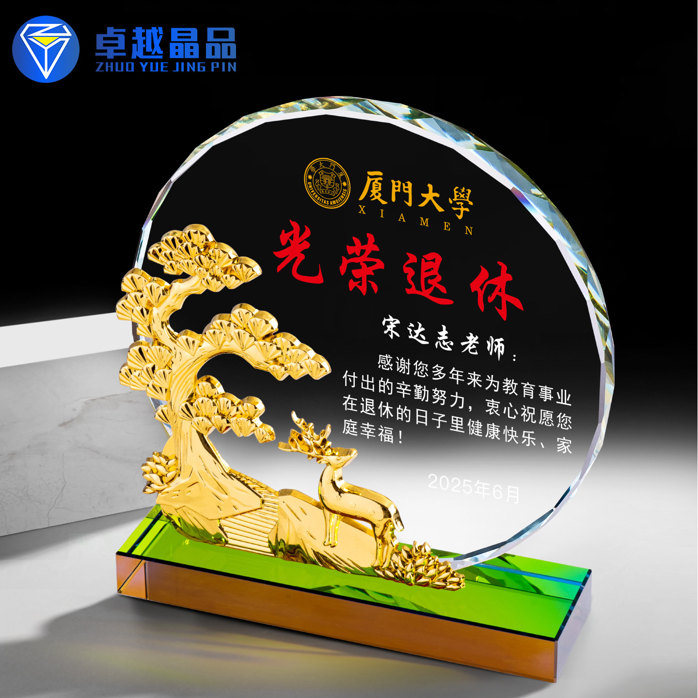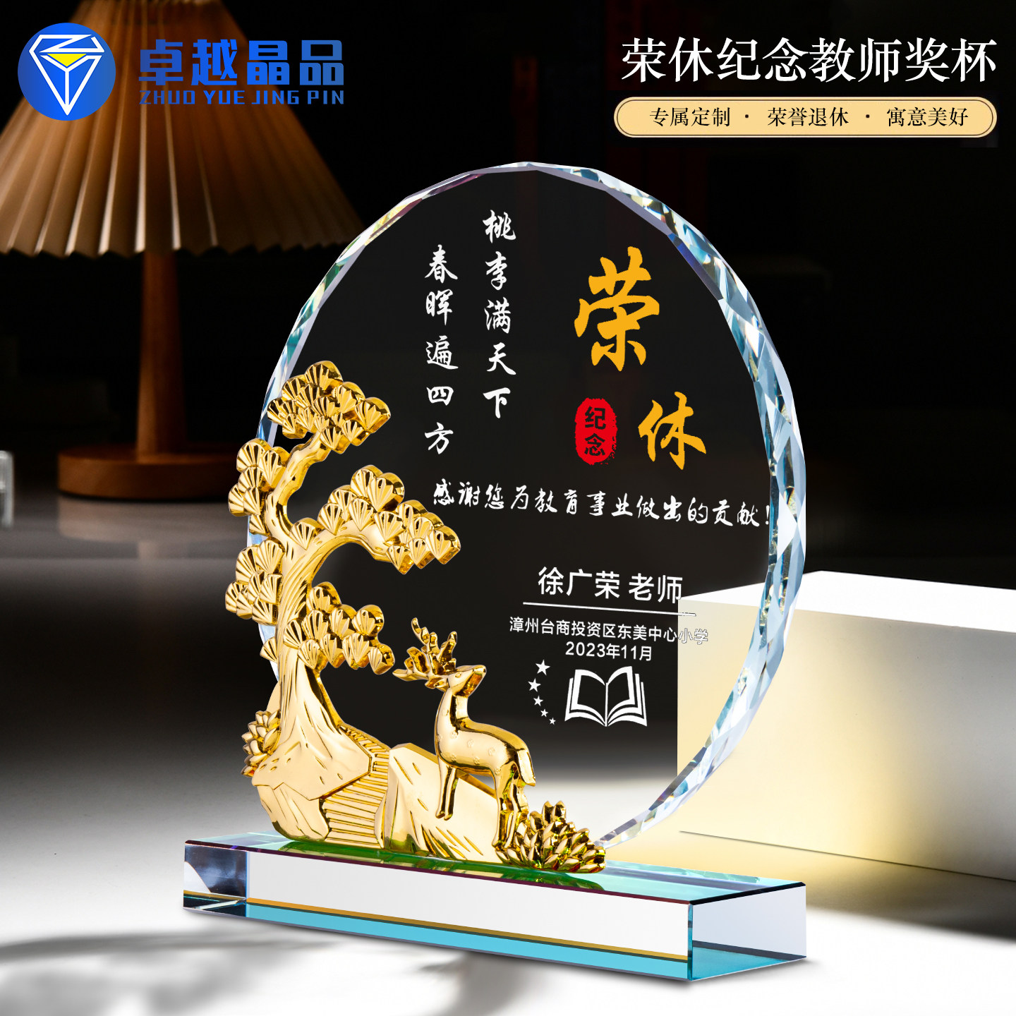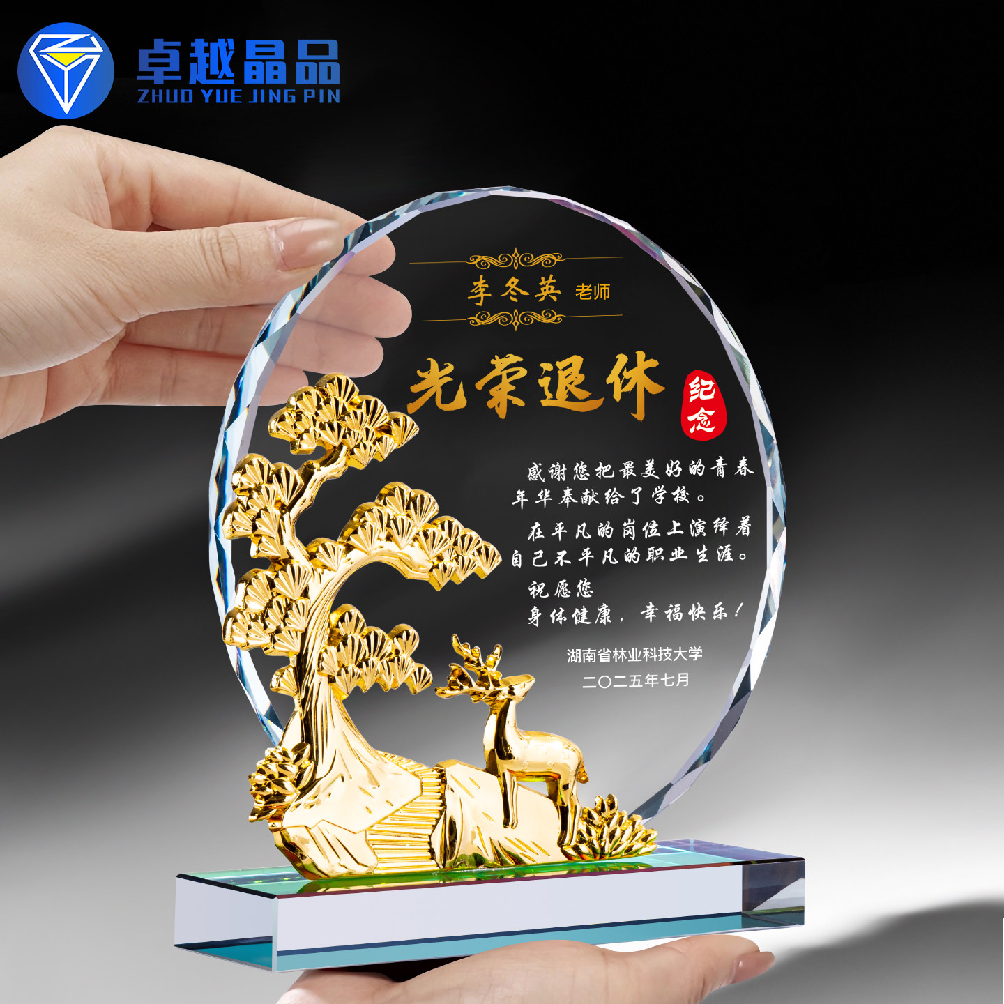 📚 金属鹿高档水晶奖杯定制做送老师教师光荣退休纪念品感谢牌