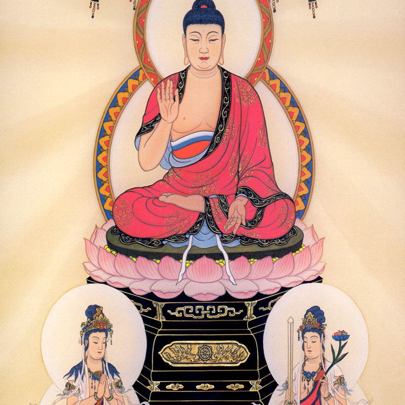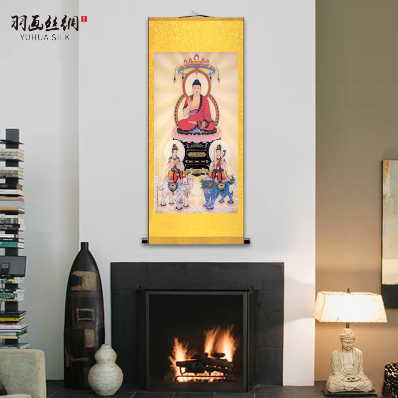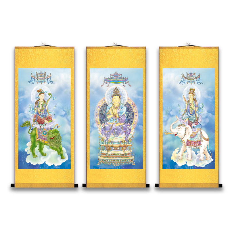 📚 佛华严三圣文殊普贤菩萨画像丝绸画寺庙佛堂客厅结缘供奉画挂画