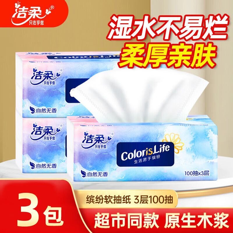 📚 【3包特惠】洁柔缤纷抽纸3层100抽家用实惠餐巾纸面巾纸卫生纸巾