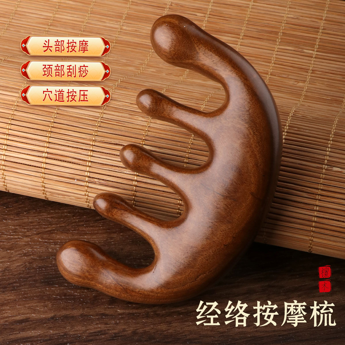 📚 五指球檀木经络按摩梳头部头皮头疗神器宽齿实木排骨梳子美发梳