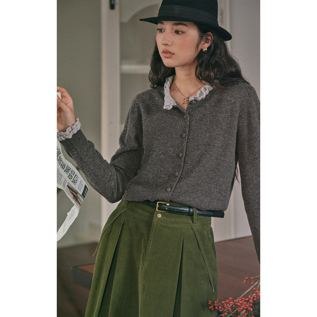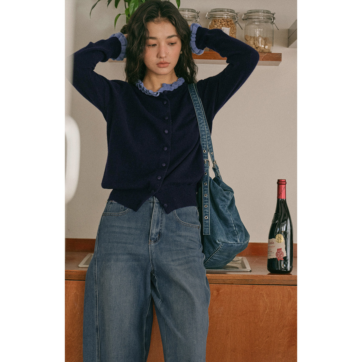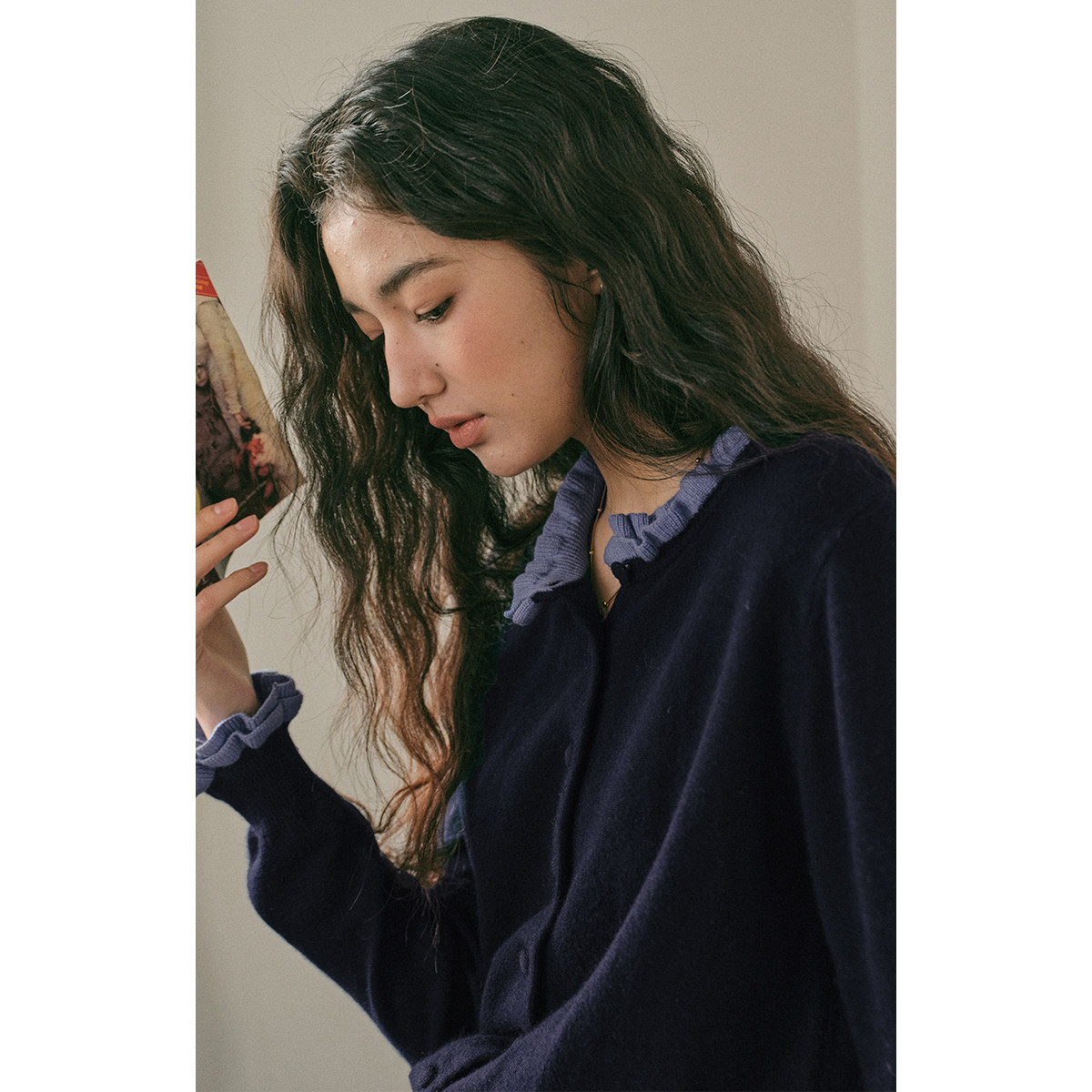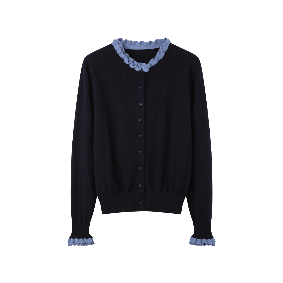 📚 solighter 100%羊毛双层撞色木耳边针织开衫女秋冬新款内搭针织衫