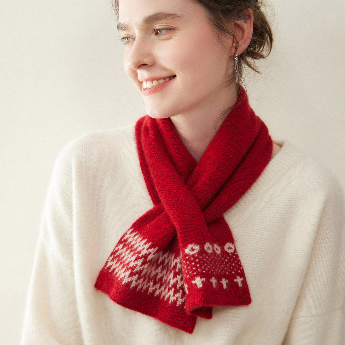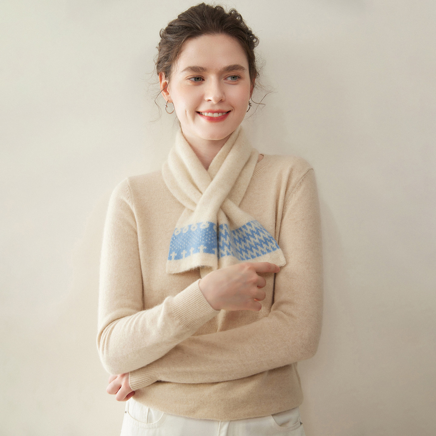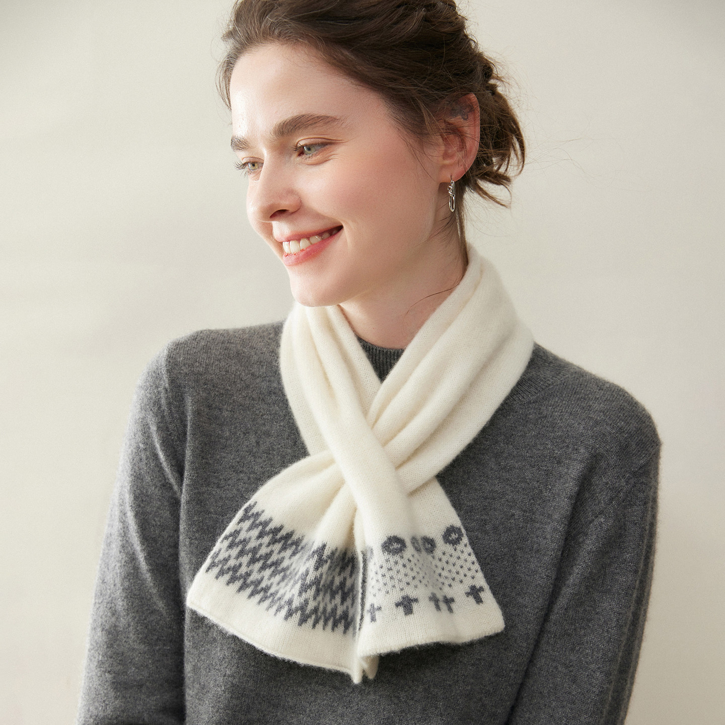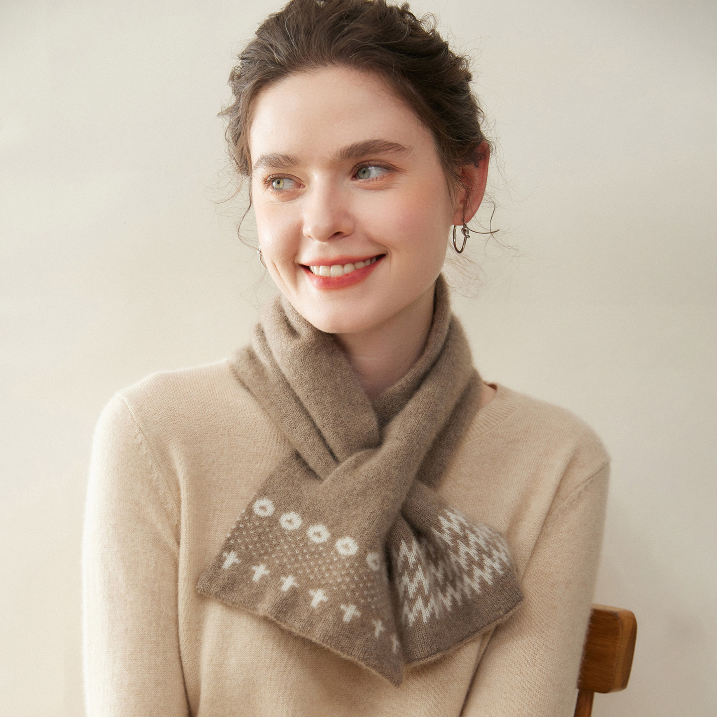 📚 时尚提花100%纯山羊绒小围巾女短款穿孔围脖保暖护颈交叉领巾