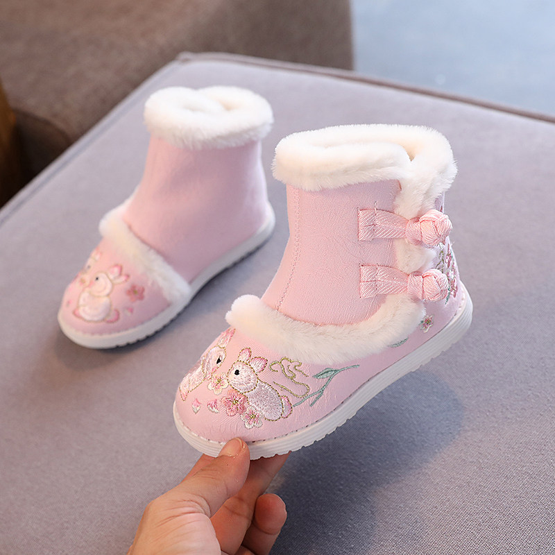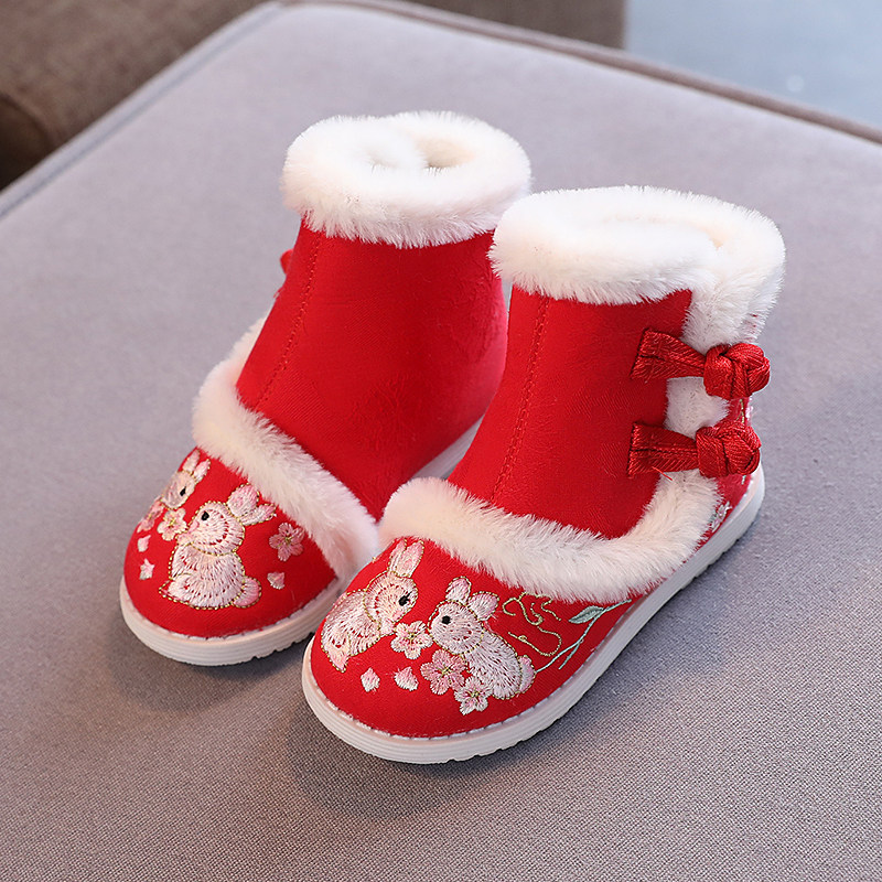 📚 冬季老北京布鞋女童绣花鞋中国风汉服冬靴复古儿童棉鞋红色拜年鞋