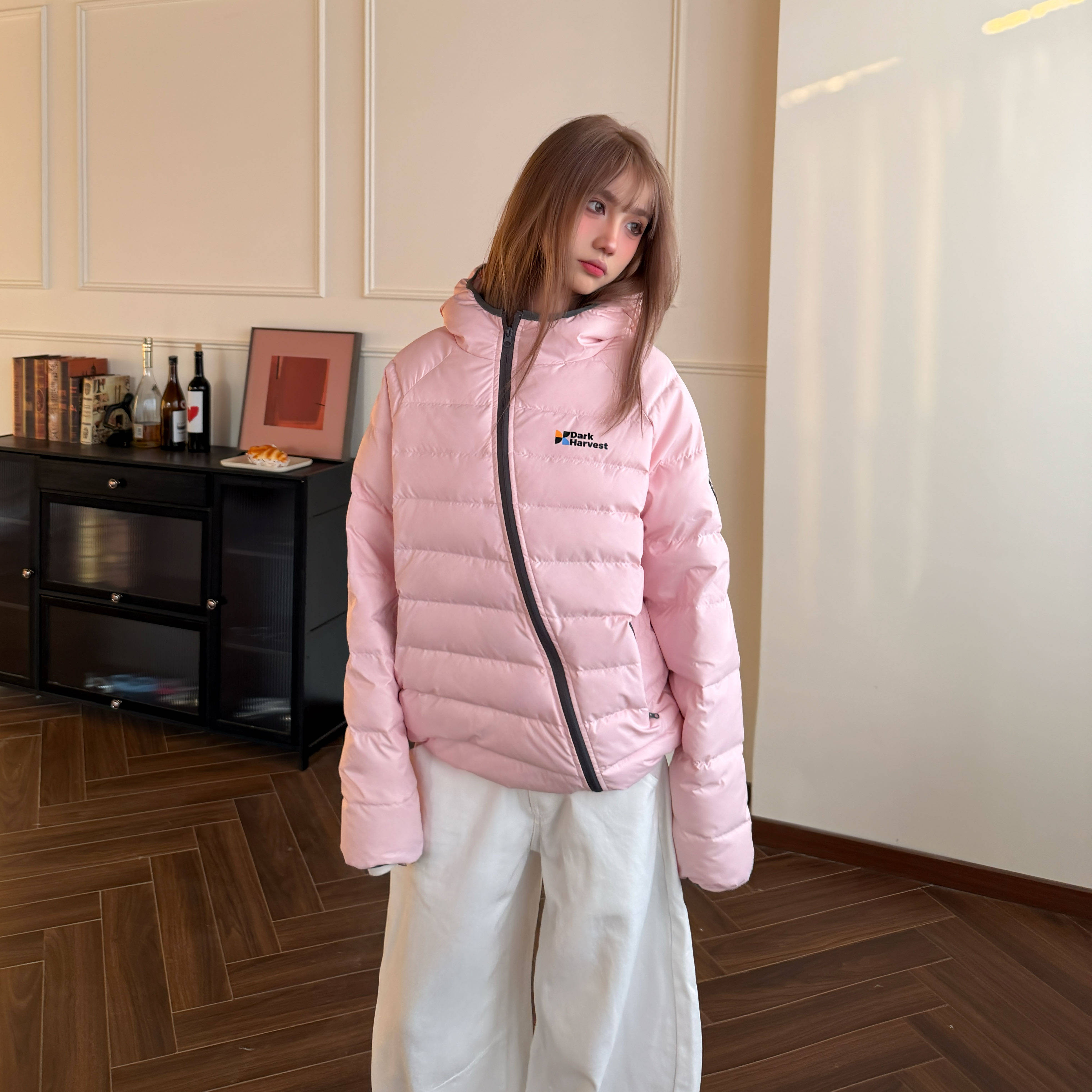 📚 Amoeba美式复古设计斜拉链轻量化保暖连帽排骨羽绒服冬季宽松外套