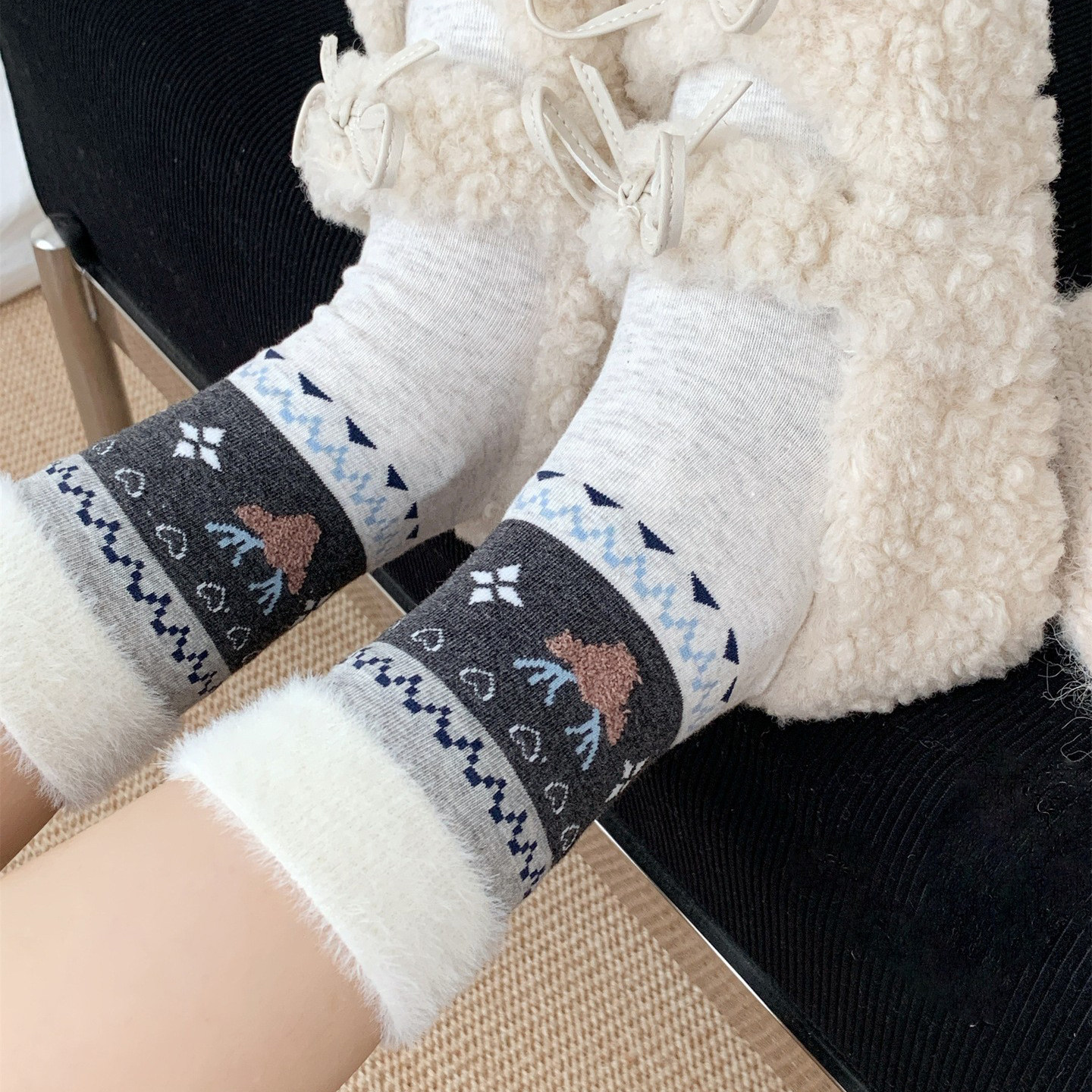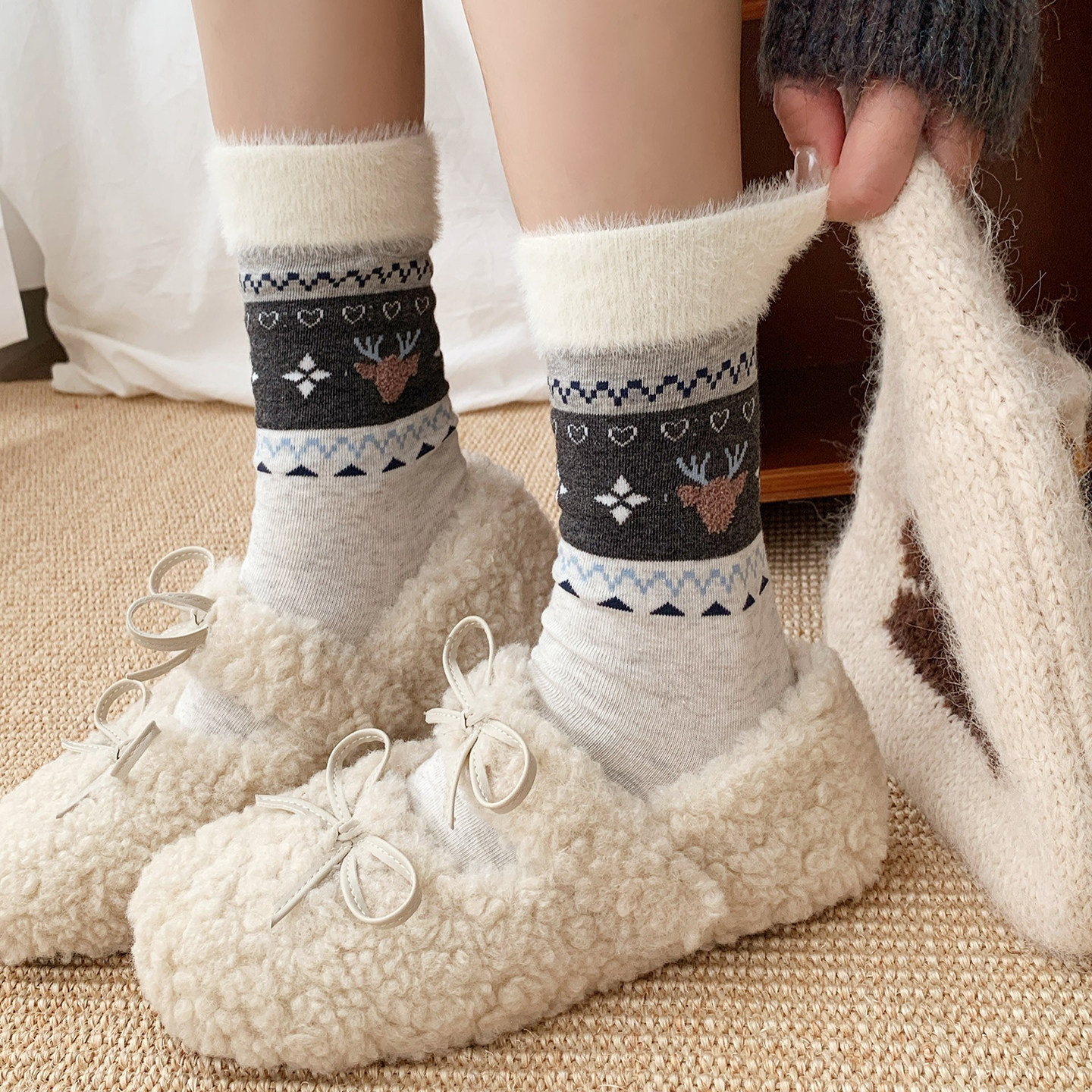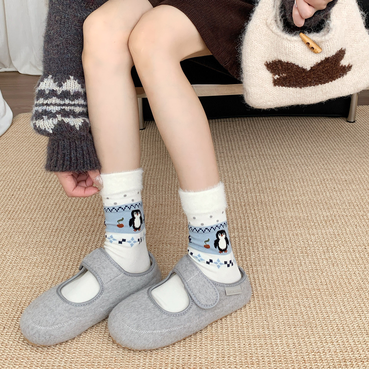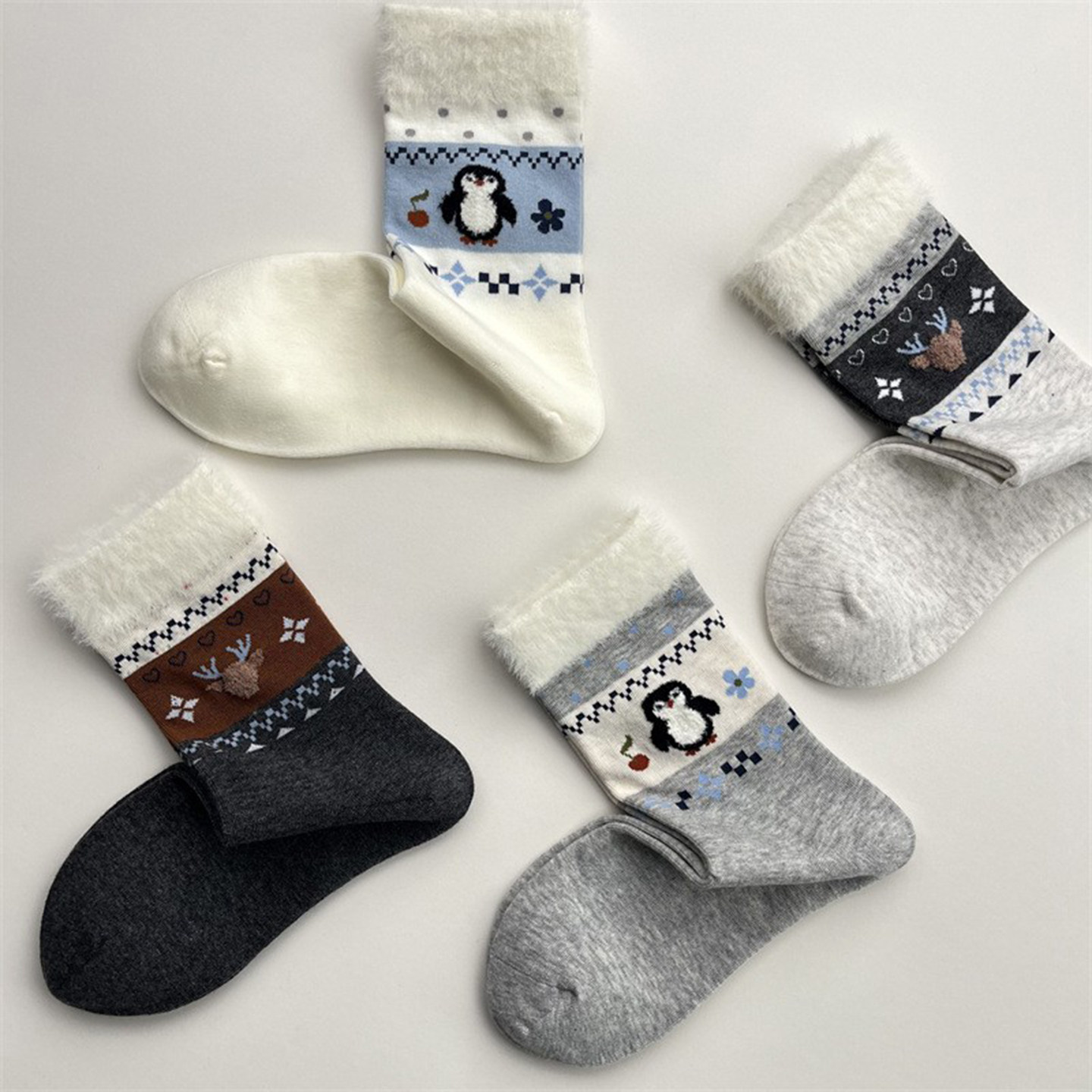 📚 秋冬毛绒袜口费尔岛卡通动物袜子女韩系可爱企鹅小鹿无骨中筒袜棉
