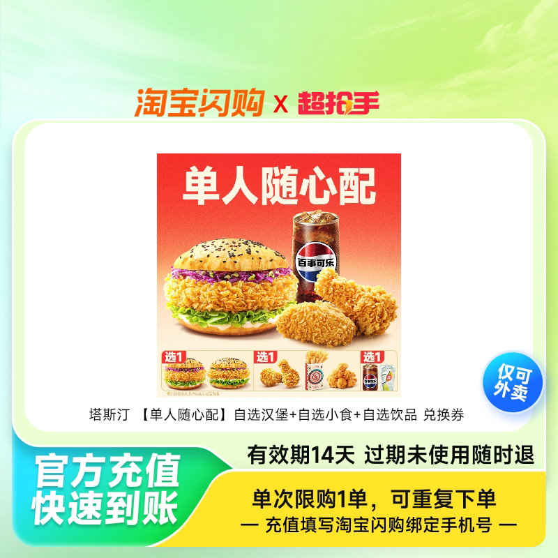 📚 【下拉享补贴价】塔斯汀香辣鸡腿堡可乐套餐淘宝闪购外卖券