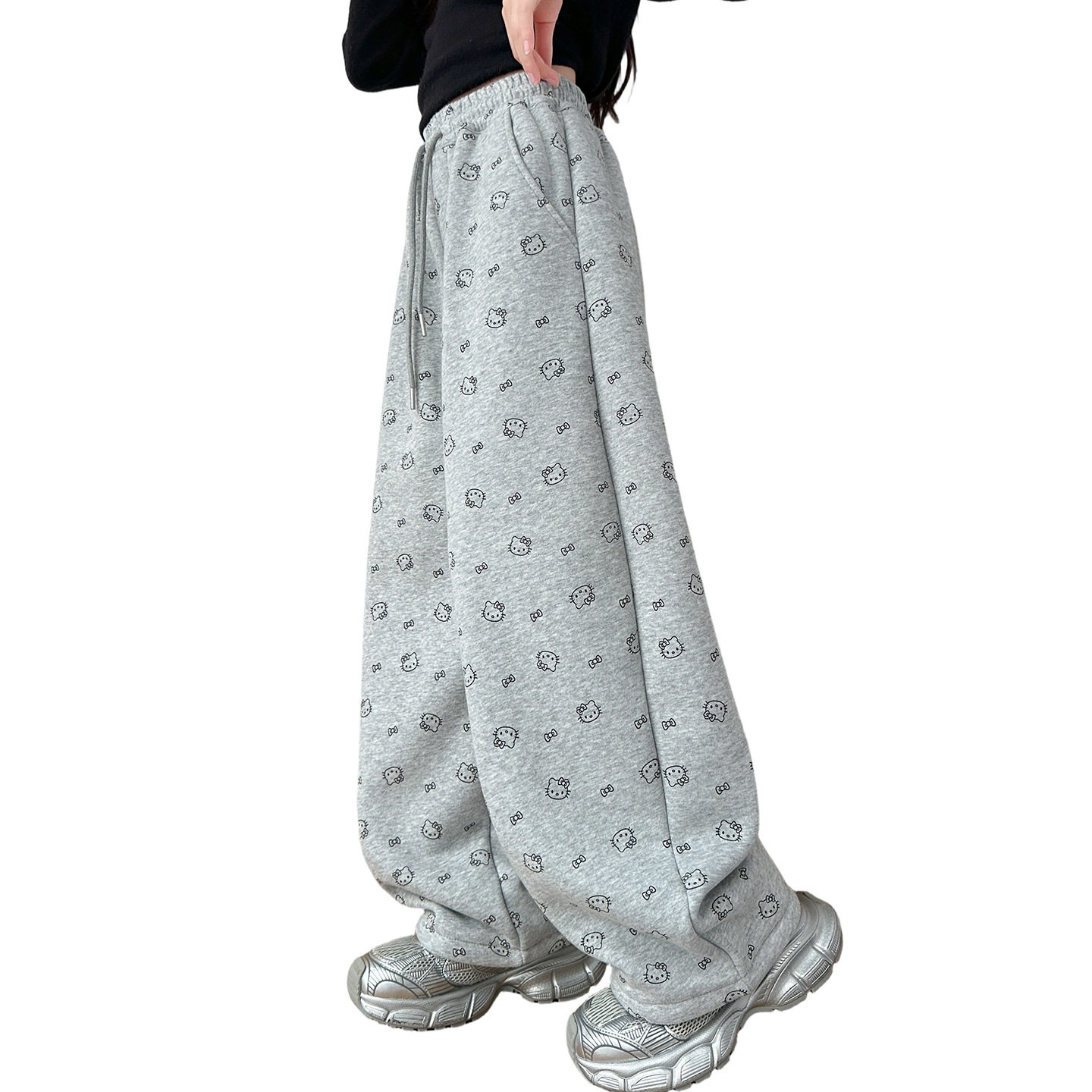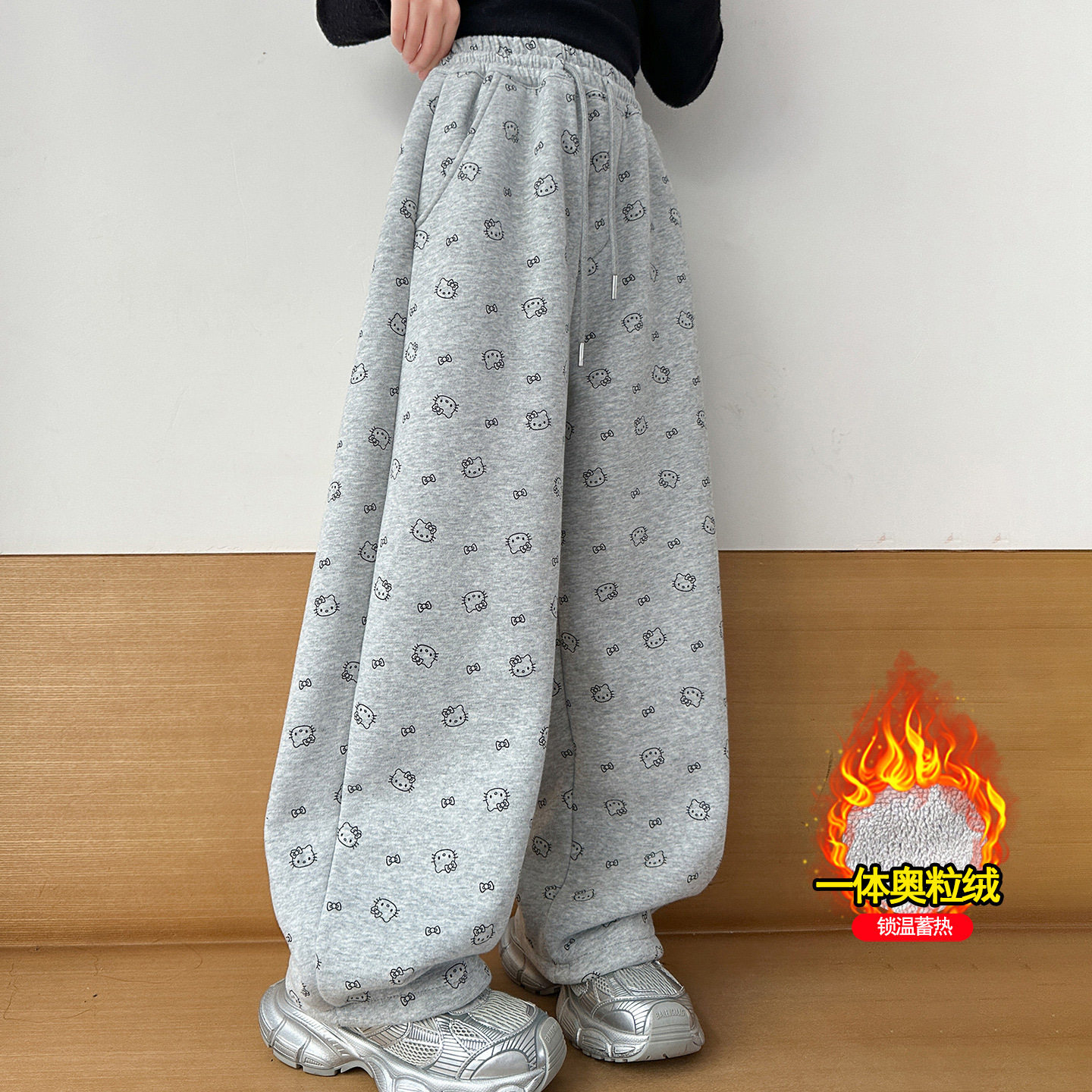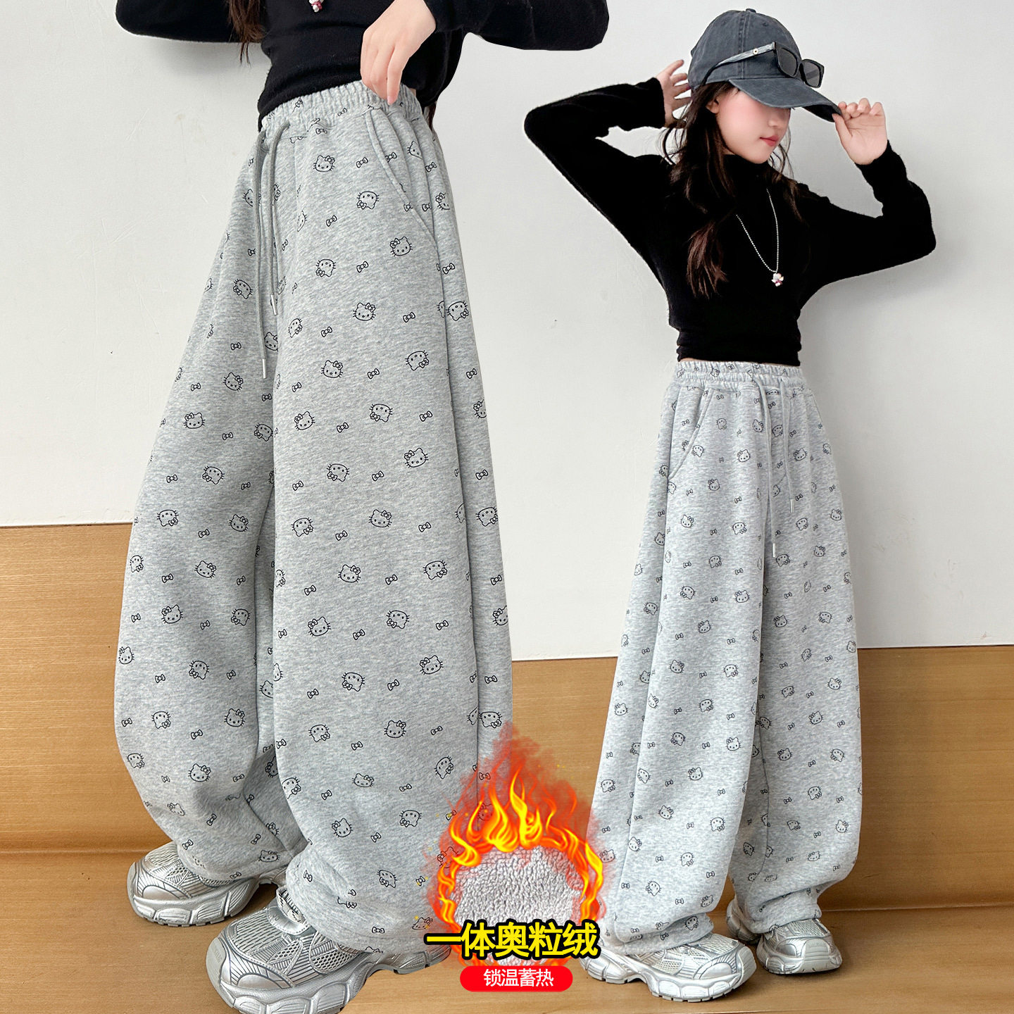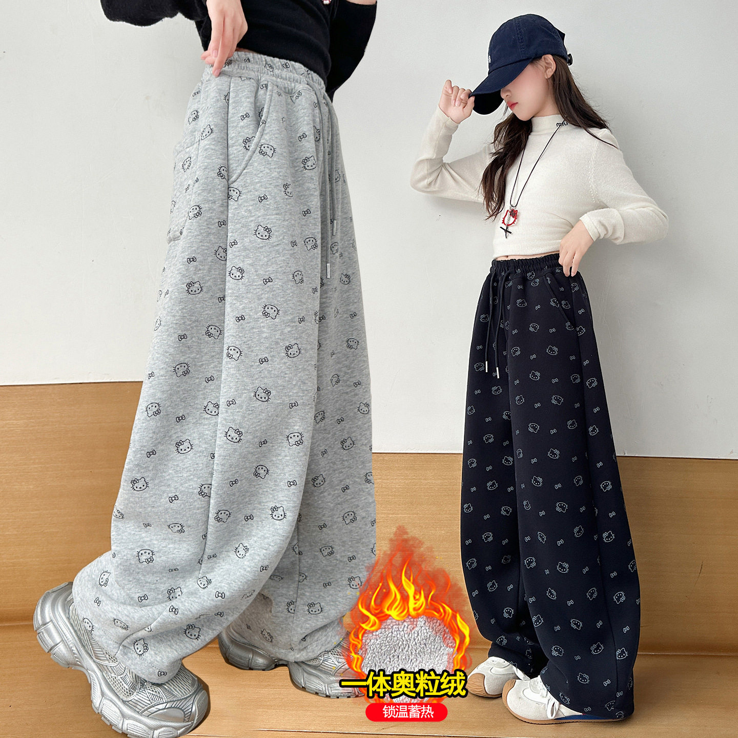 📚 女童加绒裤子2025秋冬新款洋气Kitty猫印花阔腿裤大童加绒直筒裤