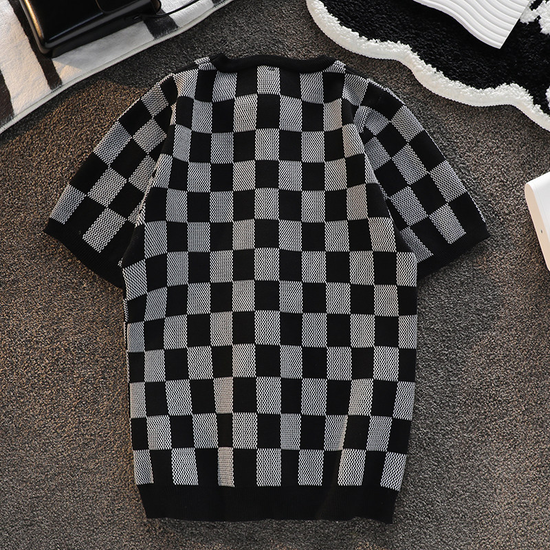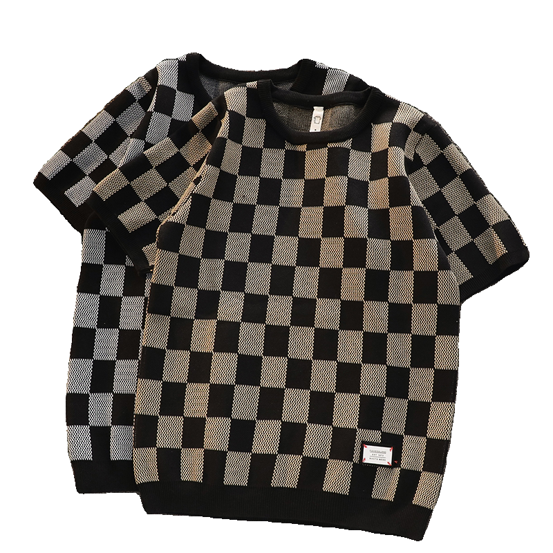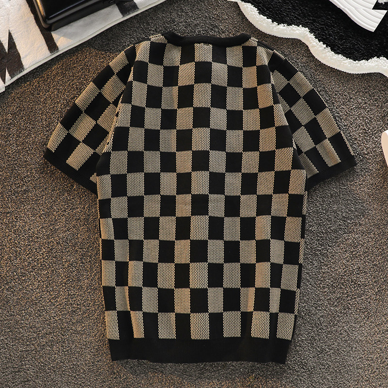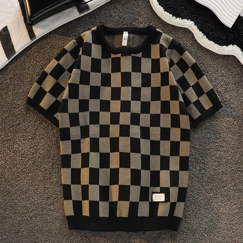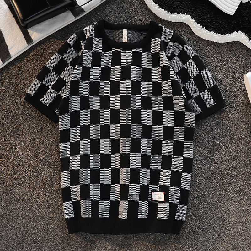 📚 春秋厚款短袖针织衫男半袖冰丝棋盘格子圆领高端休闲上衣t恤百搭