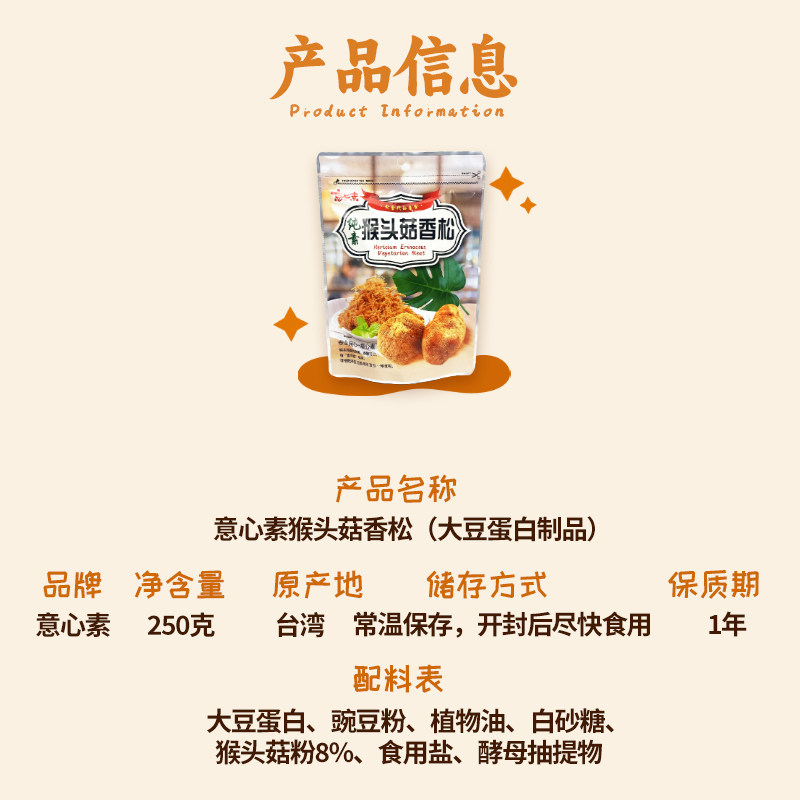 📚 台湾进口如意心素猴头菇丝250g素食佛家纯素肉松零食品小吃豆制品