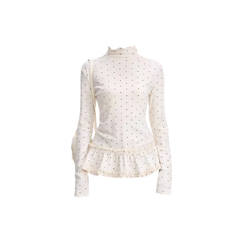 📚 波点印花韩系半高领甜美木耳边长袖T恤春秋新款修身磨毛内搭上衣