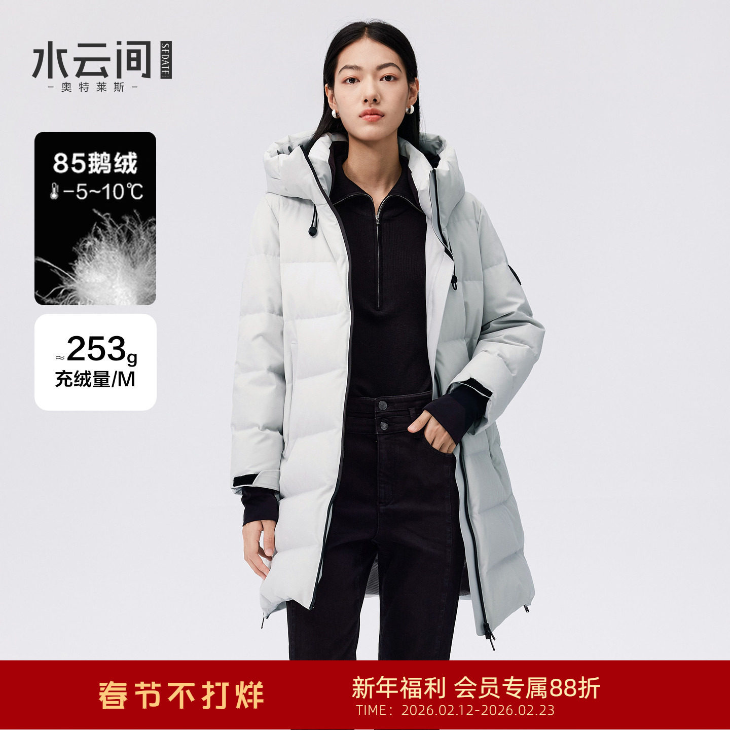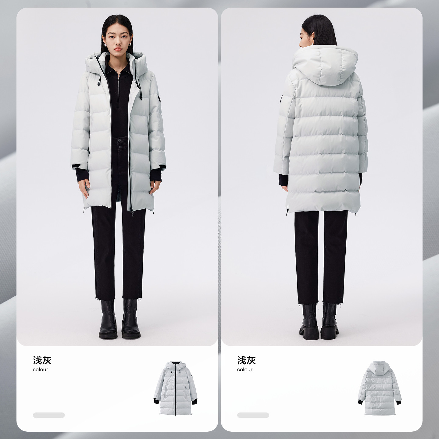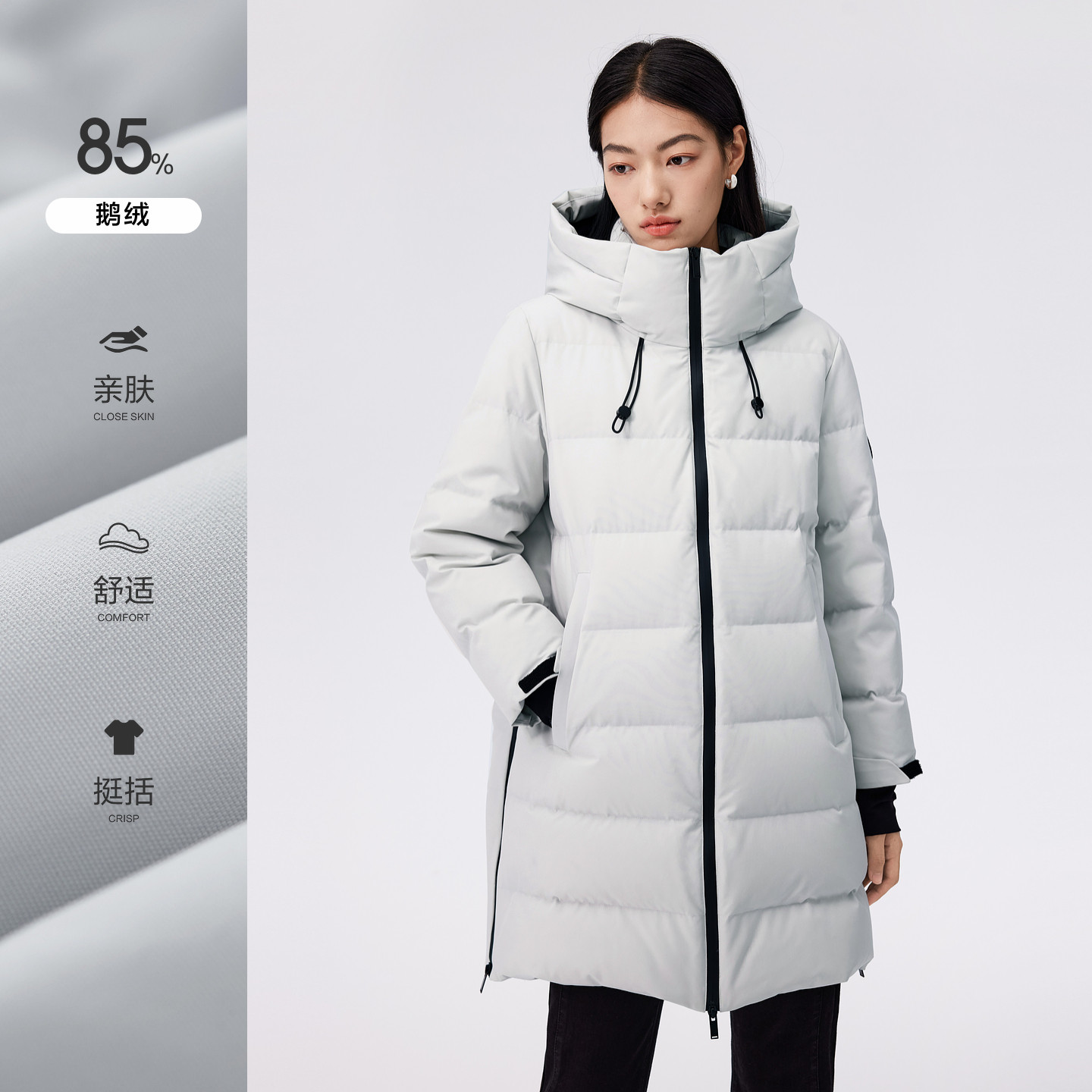 📚 水云间浅灰色中长款羽绒服女连帽立领鹅绒服保暖户外防风2026新款