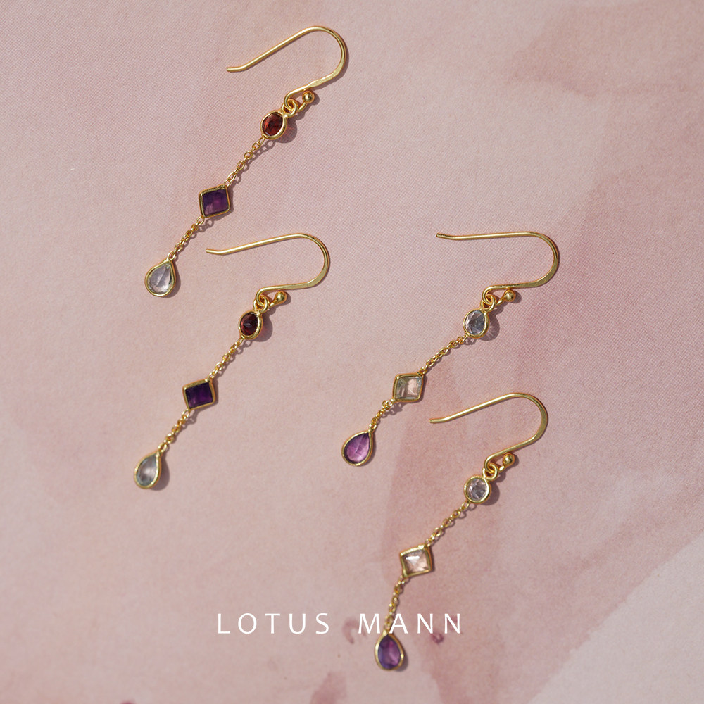 📚 生辰石.Three Drops 橄榄石托帕紫水晶水滴三色宝石银镀金耳环