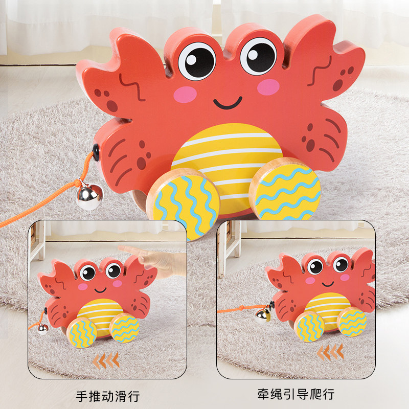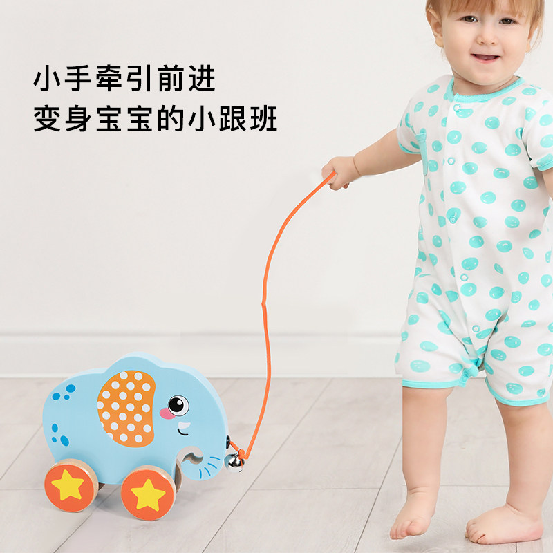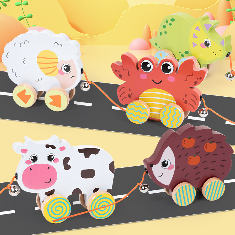 📚 宝宝益智趣味卡通动物牵引拖拉玩具跨境木制手拉绳奶牛大象鸭拖车