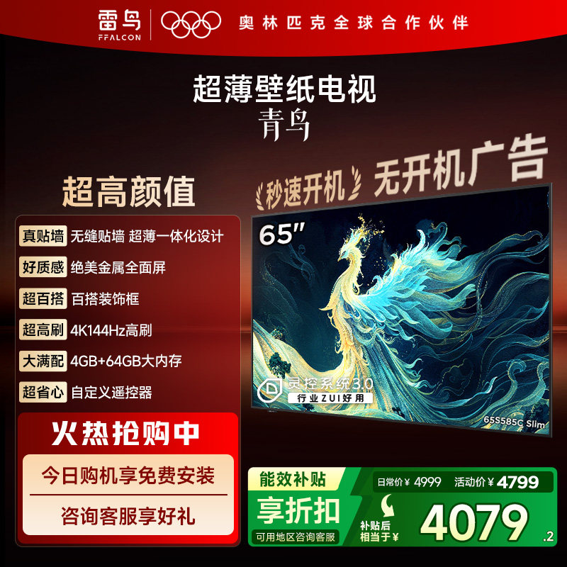 📚 TCL雷鸟青鸟65英寸无缝贴墙超薄一体化288Hz电视机以旧换新补贴75