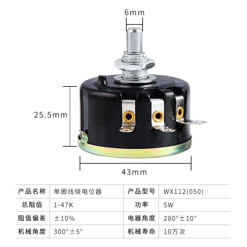 📚 单圈线绕电位器WX112 WX050功率5W星火1K2K2 4K7 10K/47K可调电阻