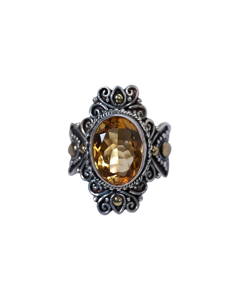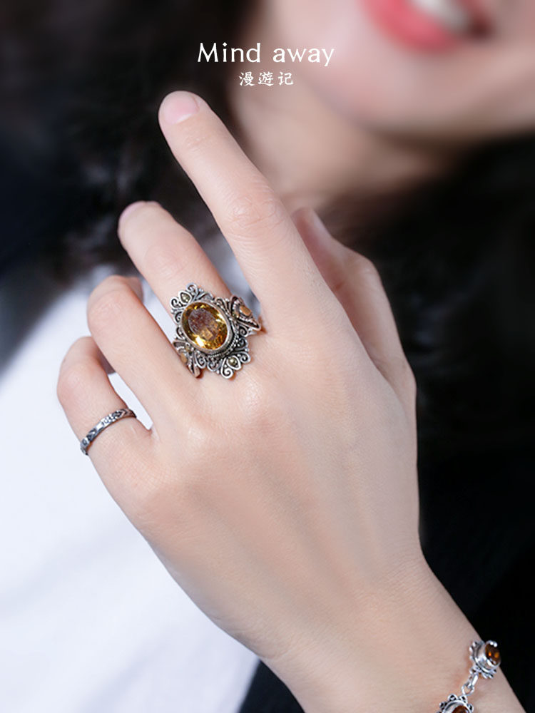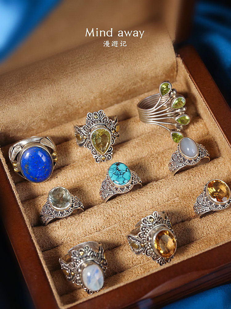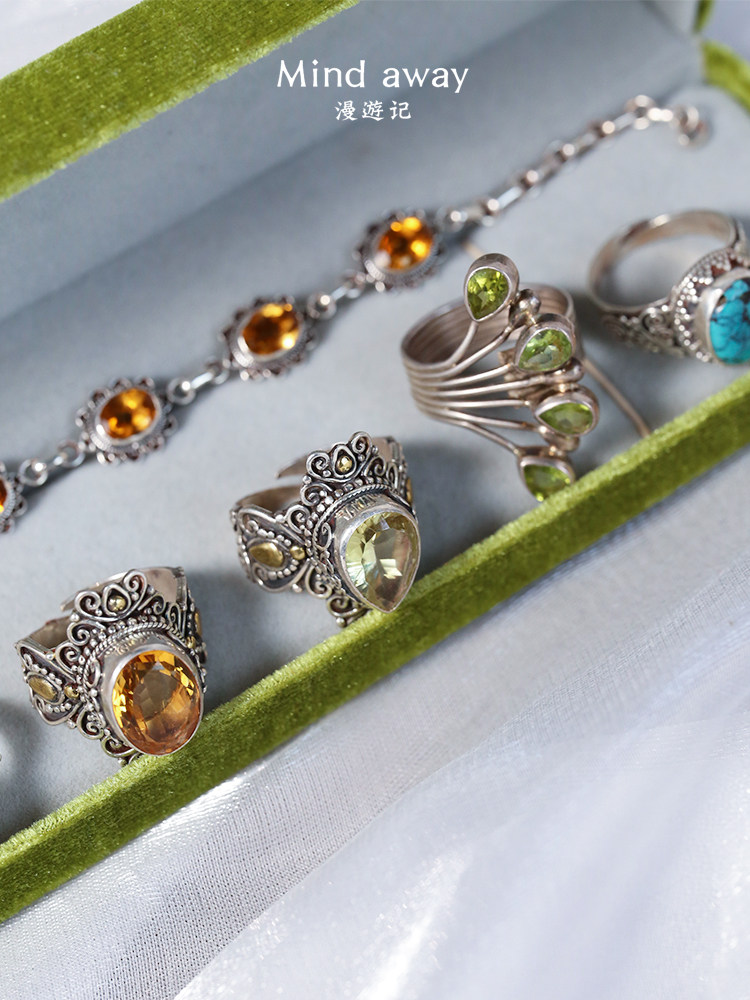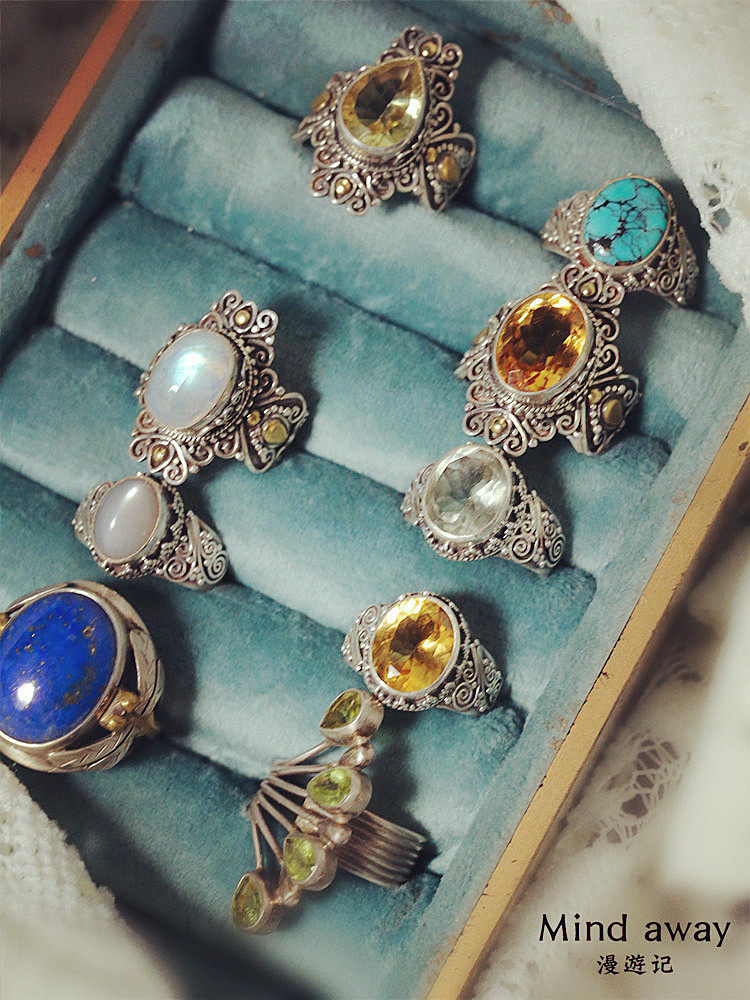📚 尼泊尔925纯银手工镶嵌天然黄水晶绿松石绿水晶月光石复古戒指女