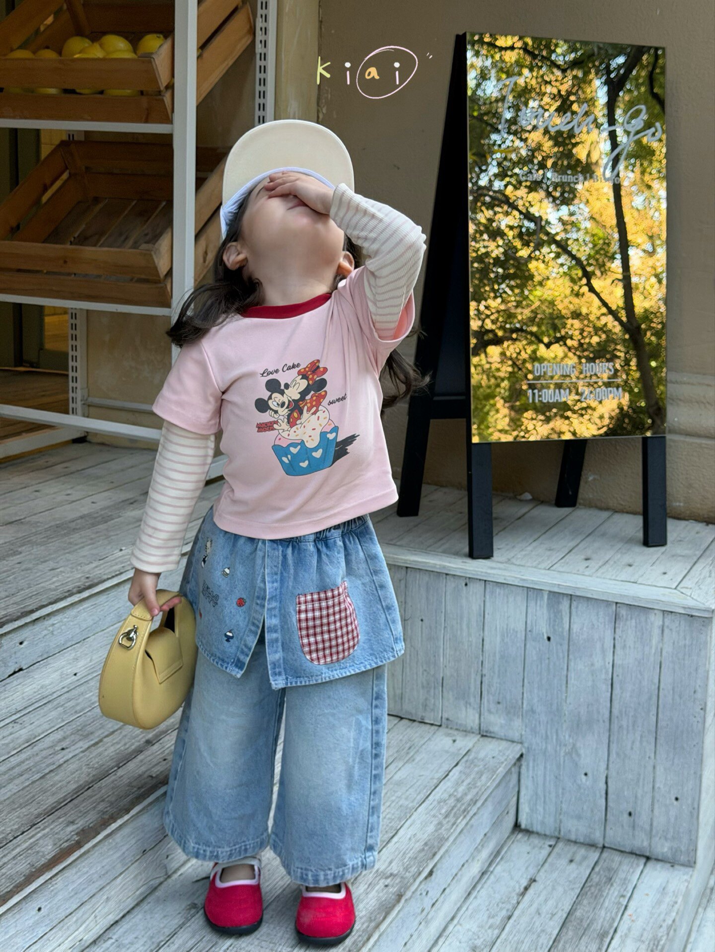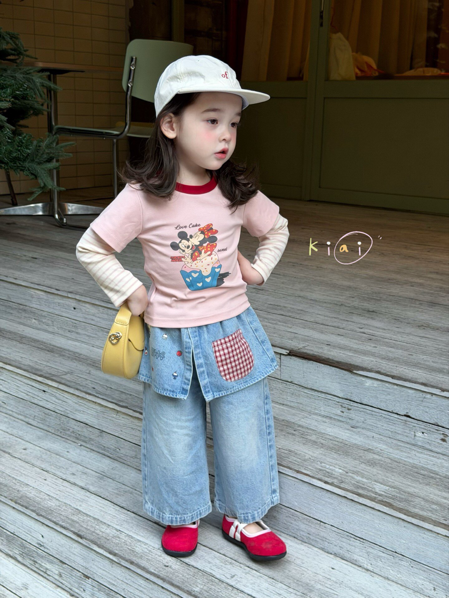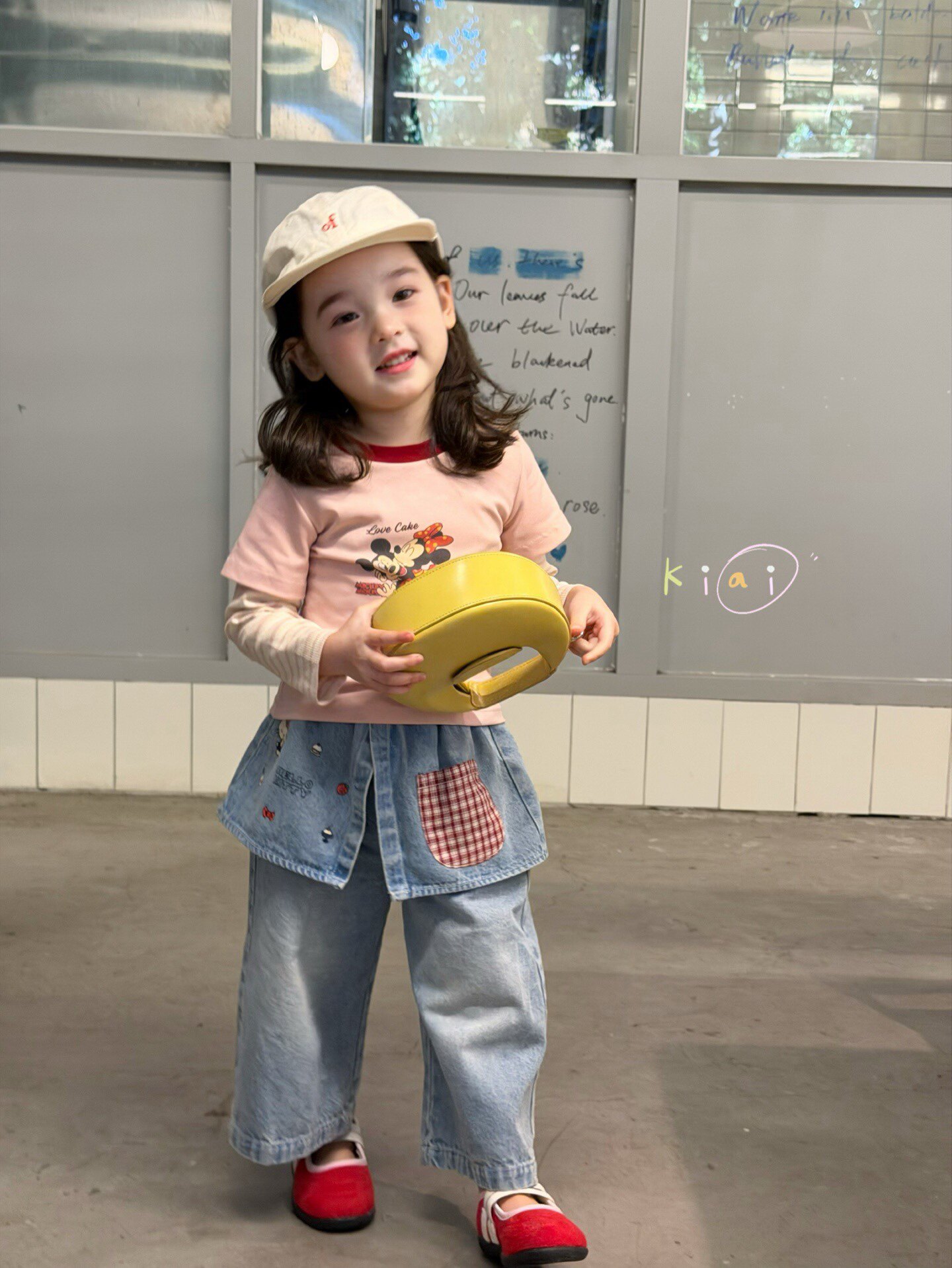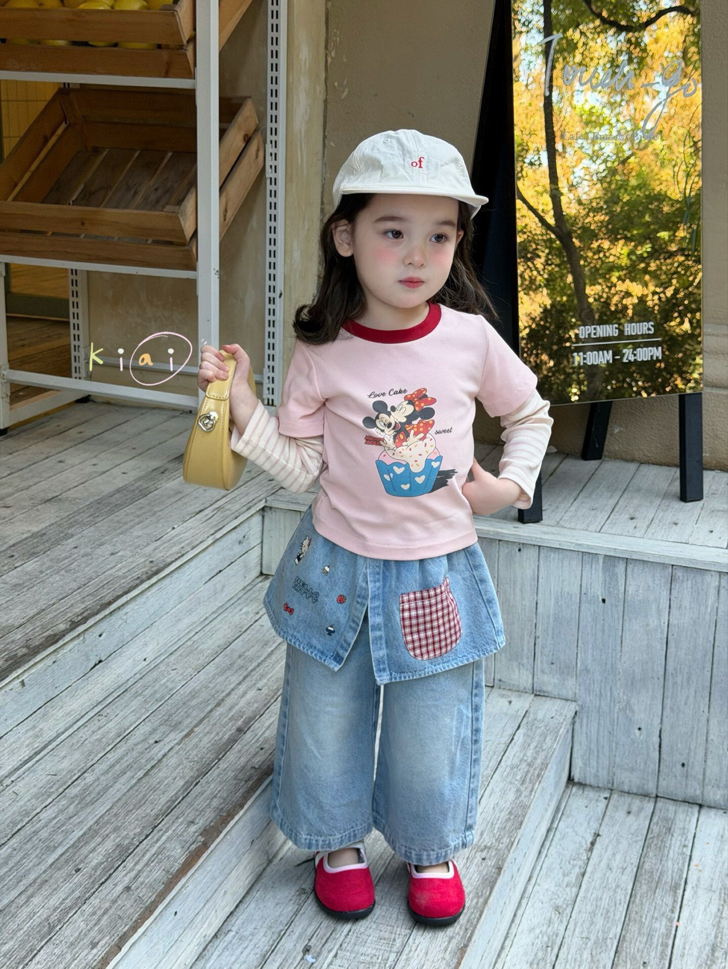 📚 凡妈童装26春款女童小童韩版米奇假两件T恤刺绣直筒牛仔长裤裙裤