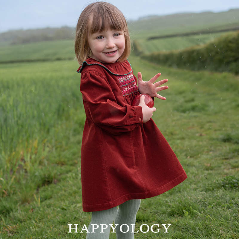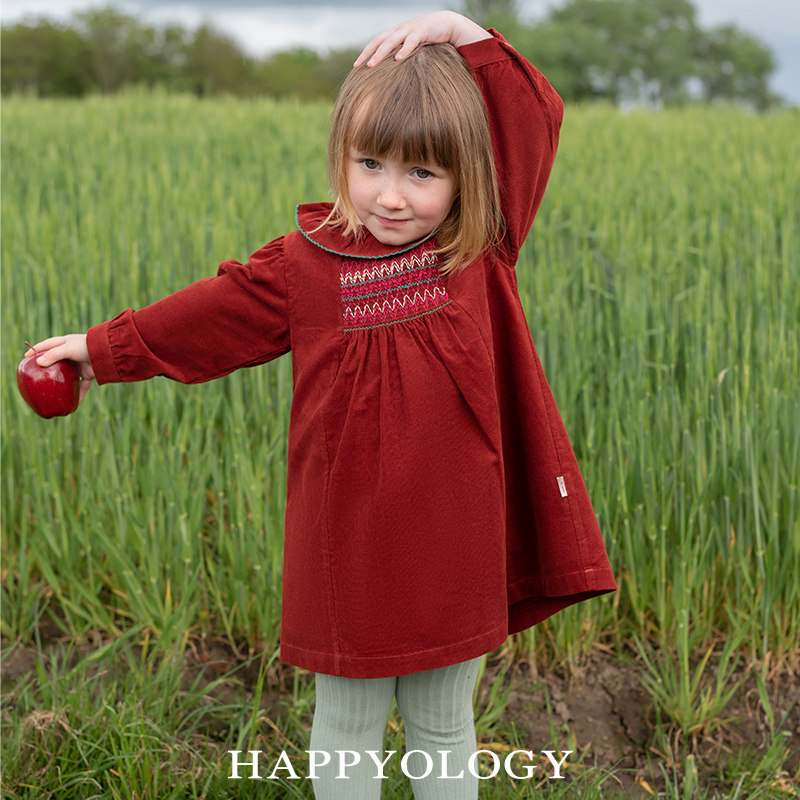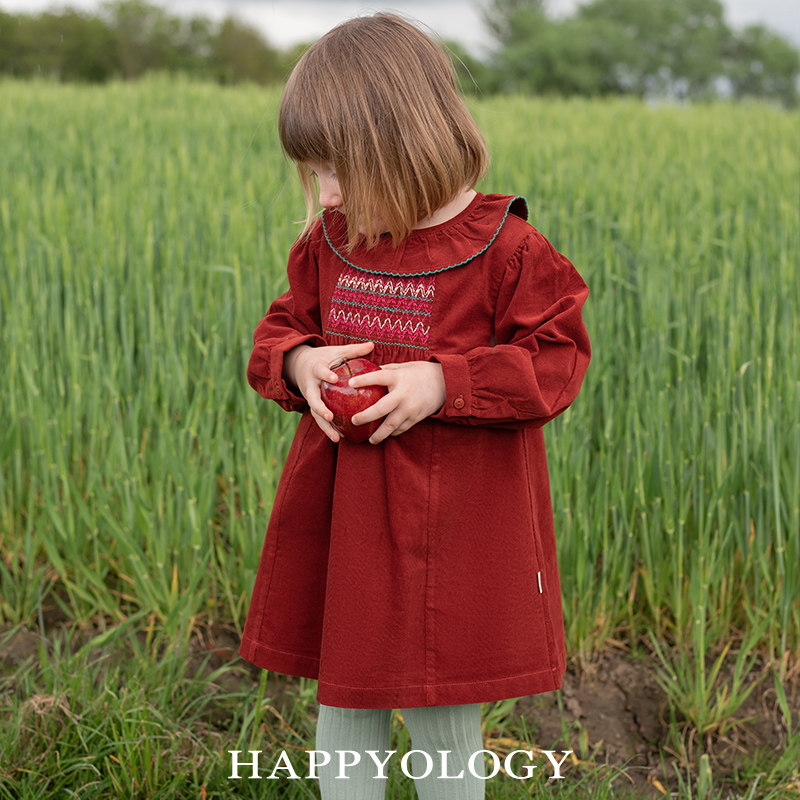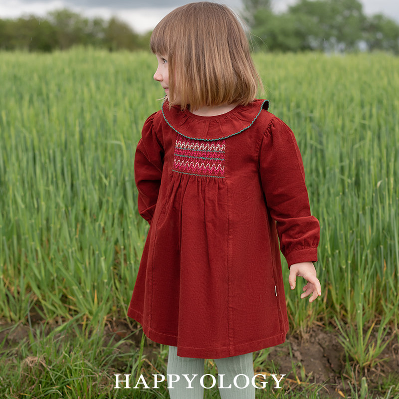 📚 Happyology儿童司马克绣花女童荷叶边翻领长袖连衣裙灯芯绒连身裙