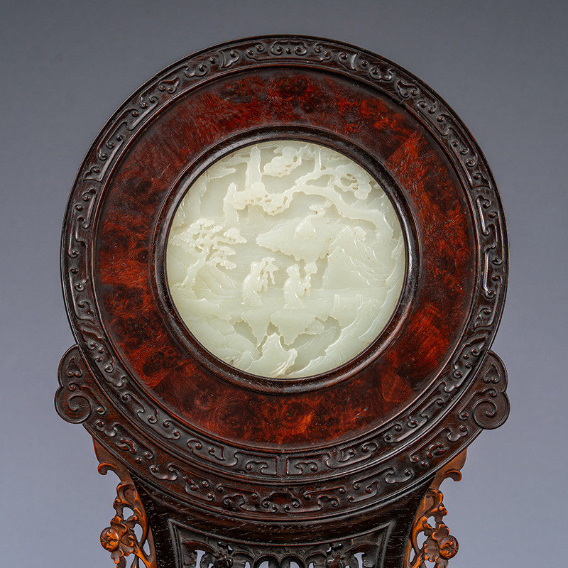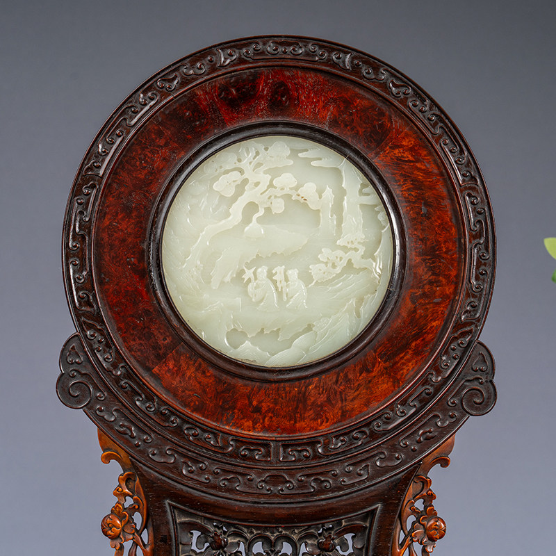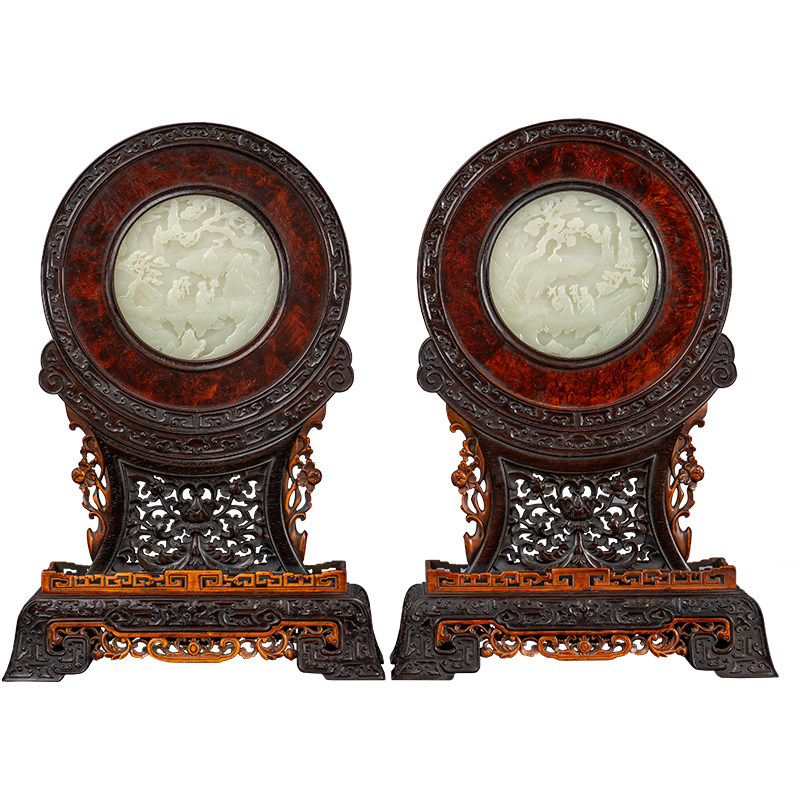 📚 清代红木及黄杨木镶瘿木嵌玉雕山水人物圆形插屏(一对)古董摆件