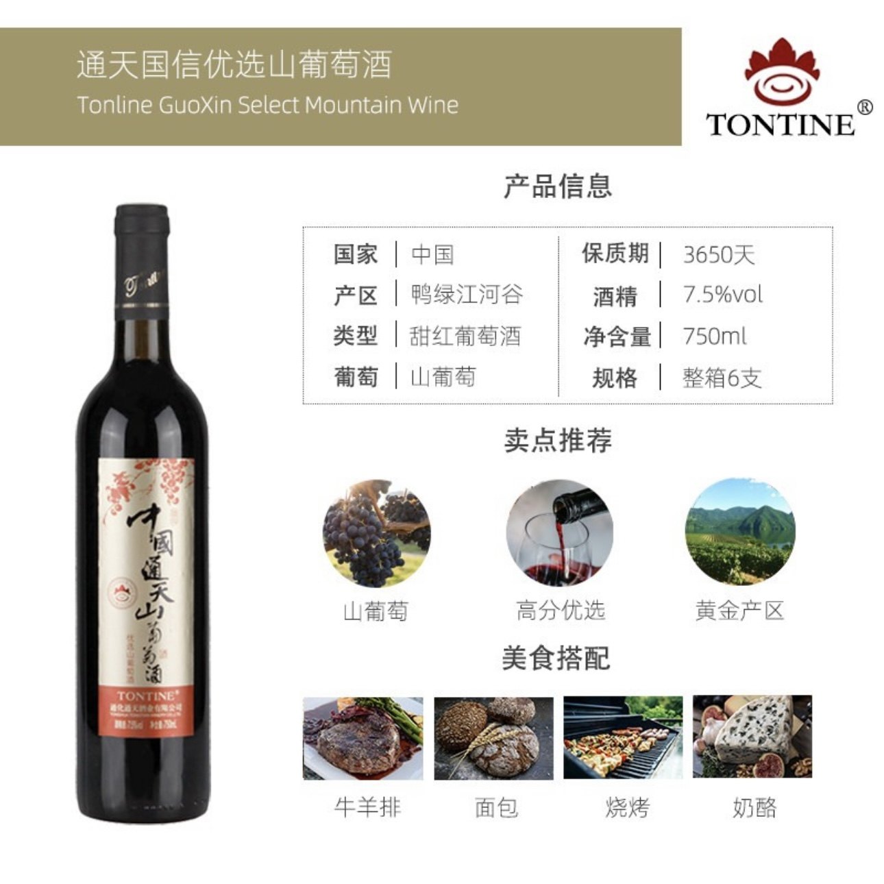 📚 通化特产葡萄酒中国通天国信优选山葡萄酒7.5度750ml女士甜型红酒