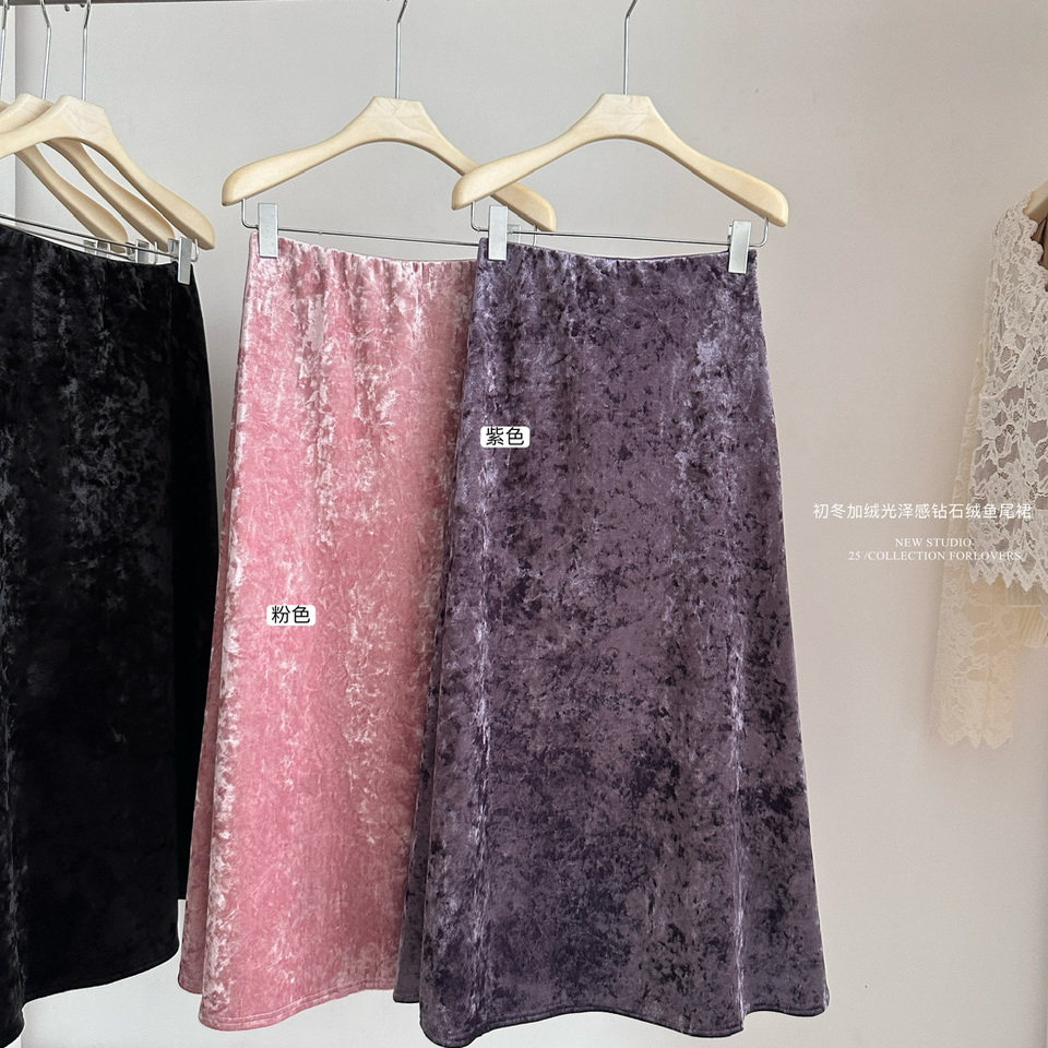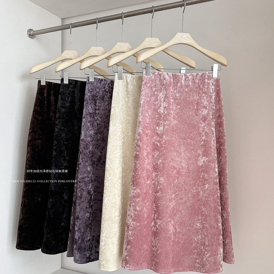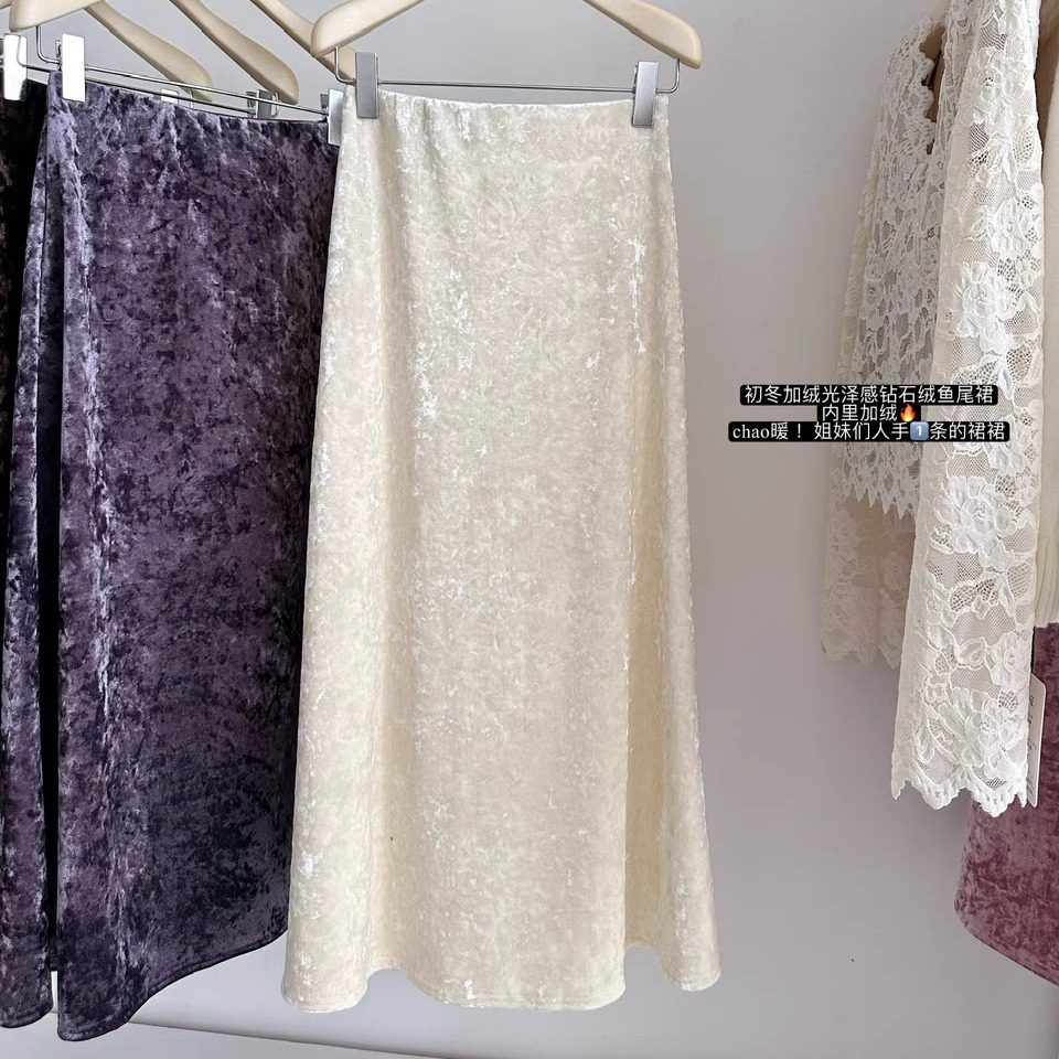 📚 初冬法式优雅金钻丝绒半身裙高级感高腰直筒加绒光泽感开叉a字裙