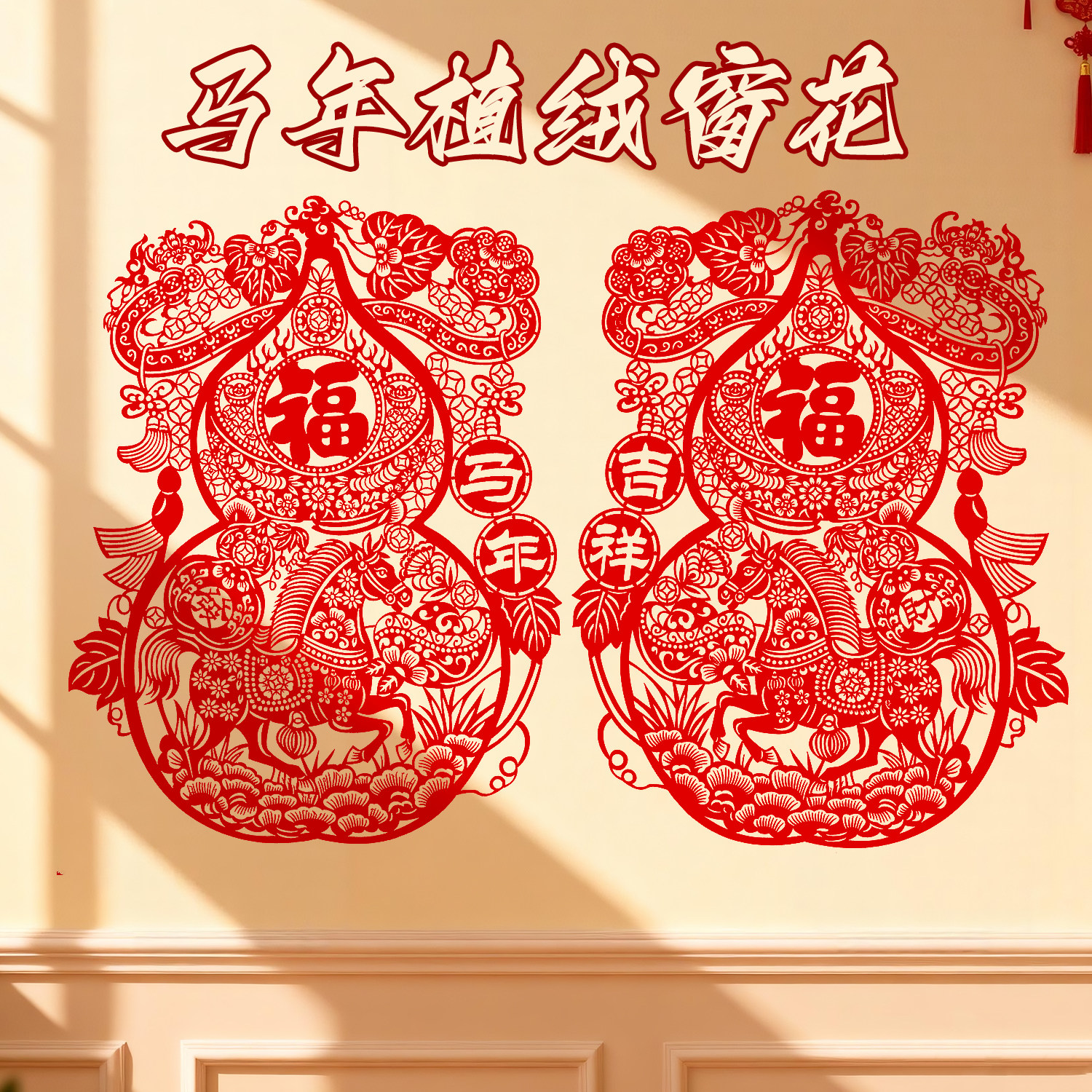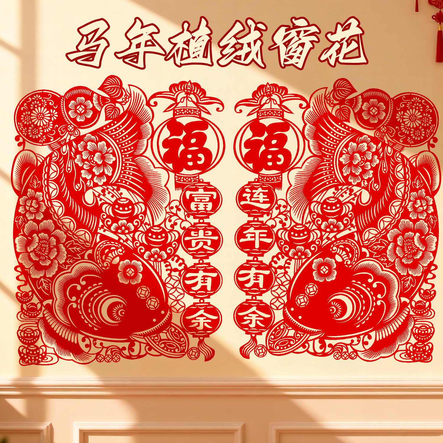 📚 2026马年窗贴新年画春节装饰植绒布剪纸大窗花玻璃贴植绒福字贴纸