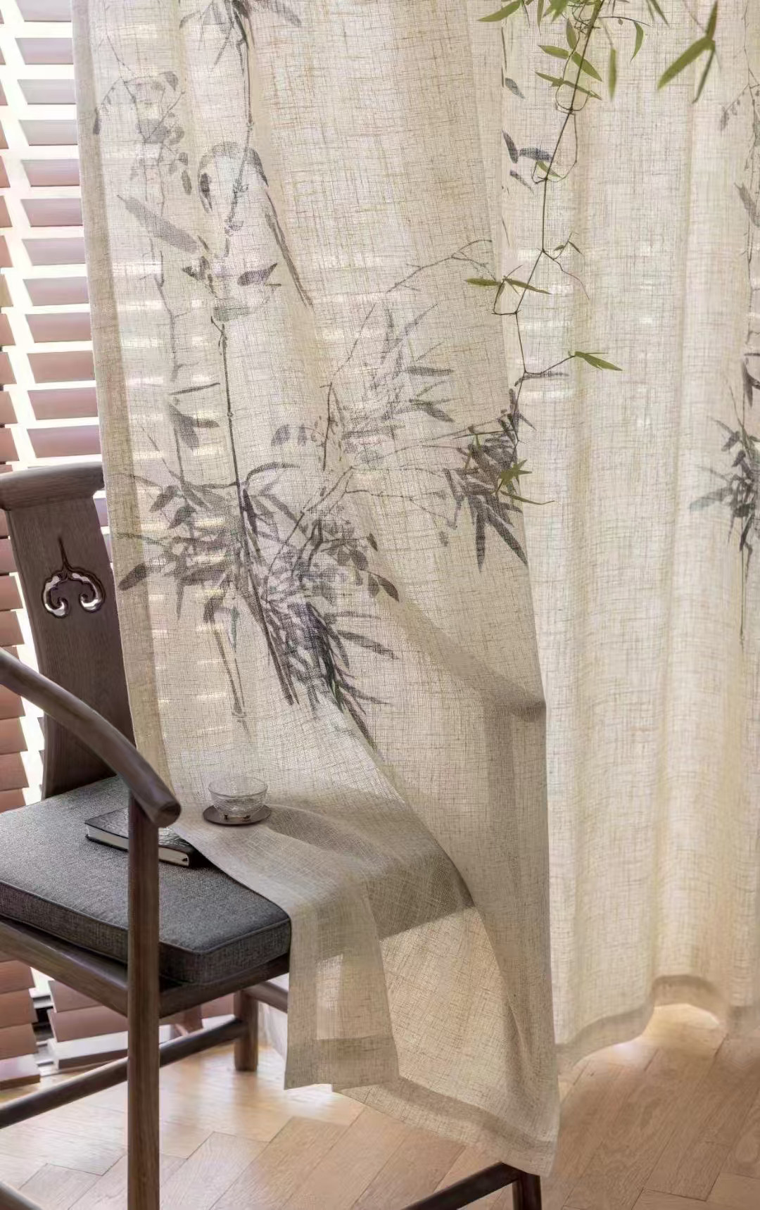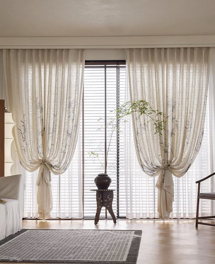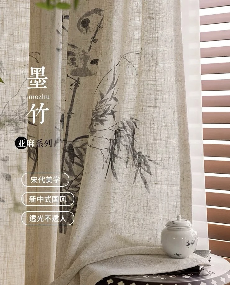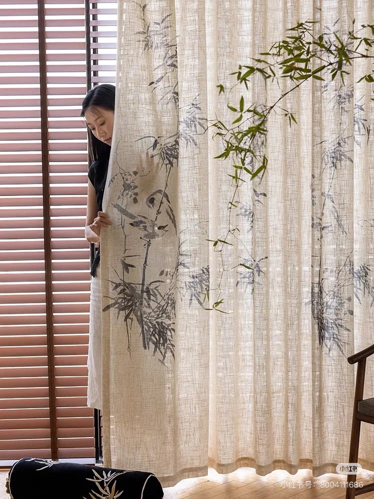 📚 竹影纱 新中式国风亚麻纱客厅阳台书房竹叶纱帘棉麻感透光不透人