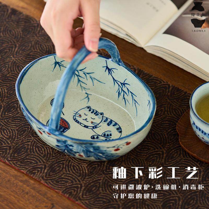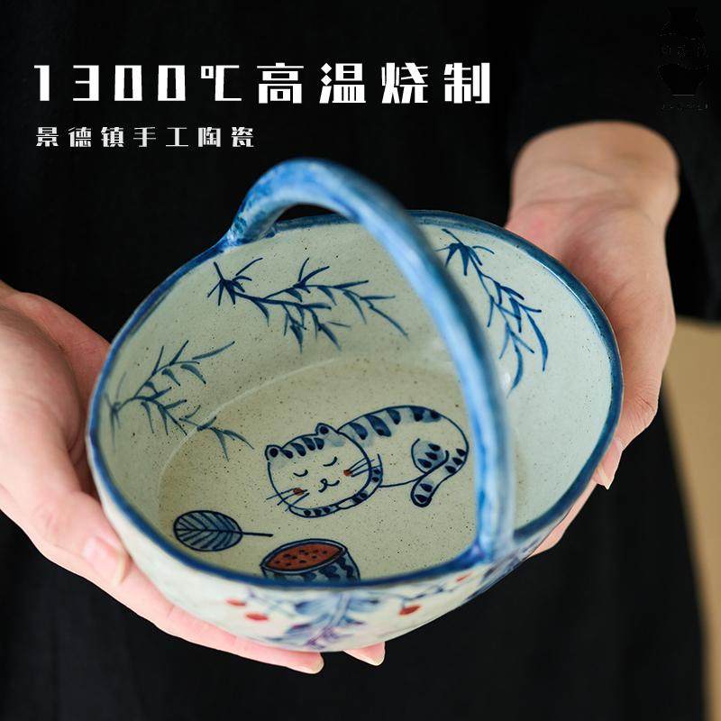 📚 陶美集手绘青花瓷提篮果盘景德镇手工釉下彩中式猫咪带提手盘子小