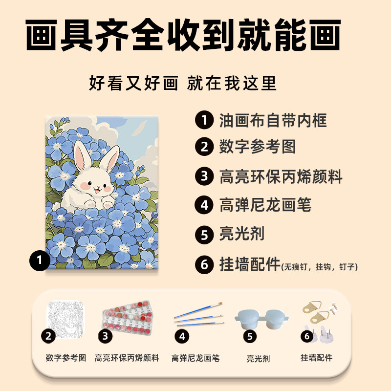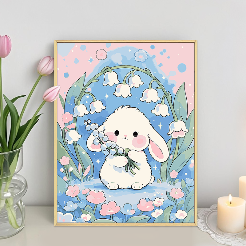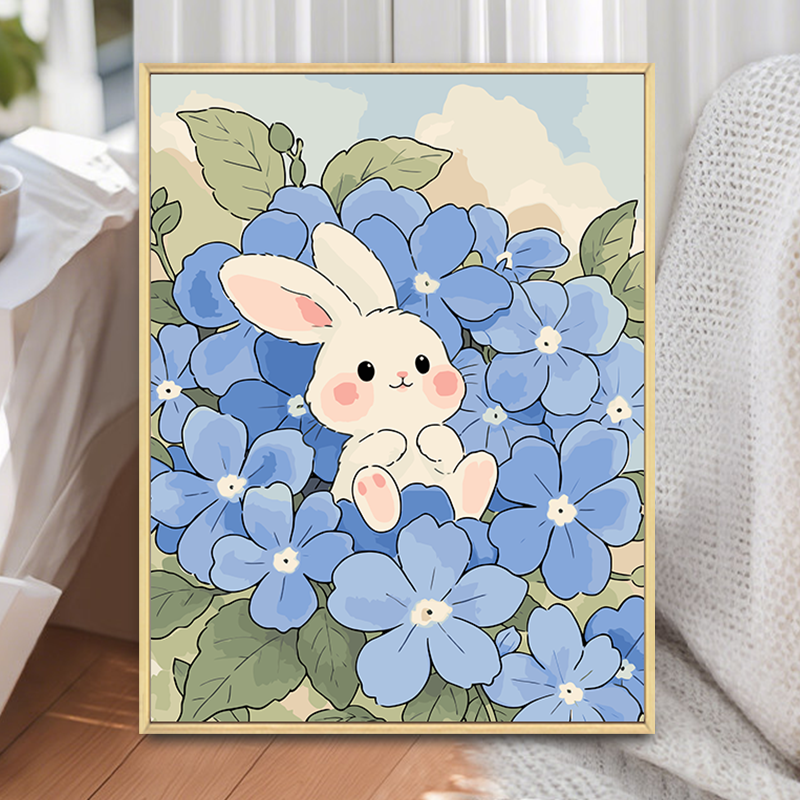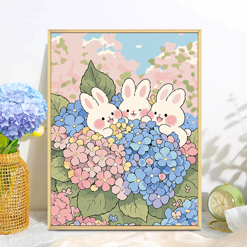 📚 绣球花小兔子数字油画diy填充填色手工绘铃兰花卉丙烯油彩装饰画