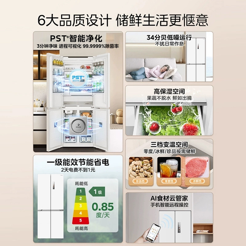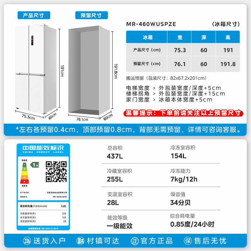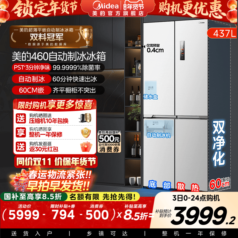 📚 美的460自动制冰冰箱超薄零嵌入式家用十字双开四门白色换新补贴