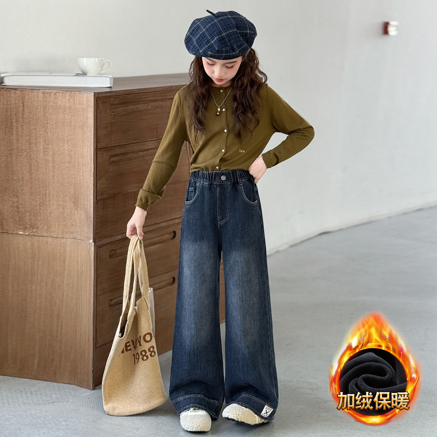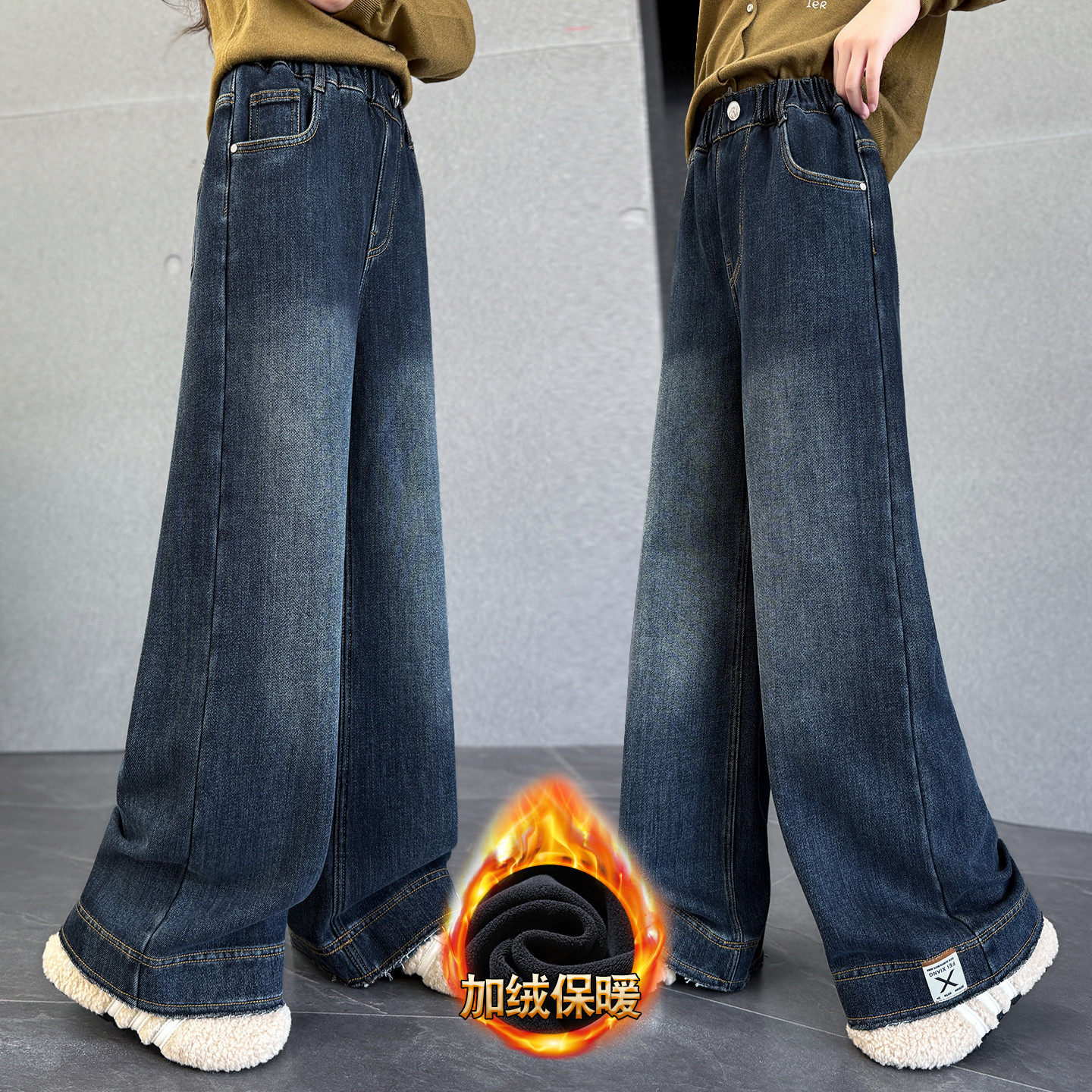 📚 女童加绒牛仔裤2025新款秋冬大童宽松一体绒阔腿裤初中生冬天长裤