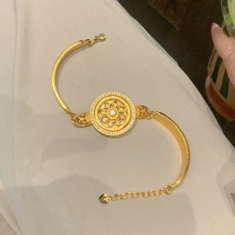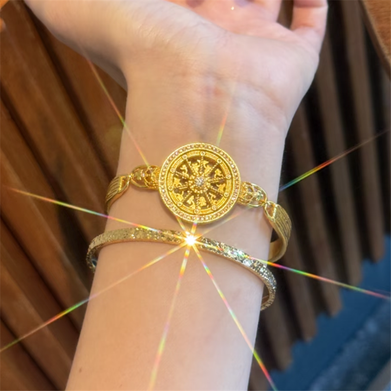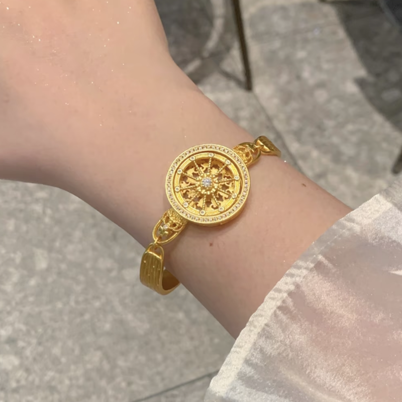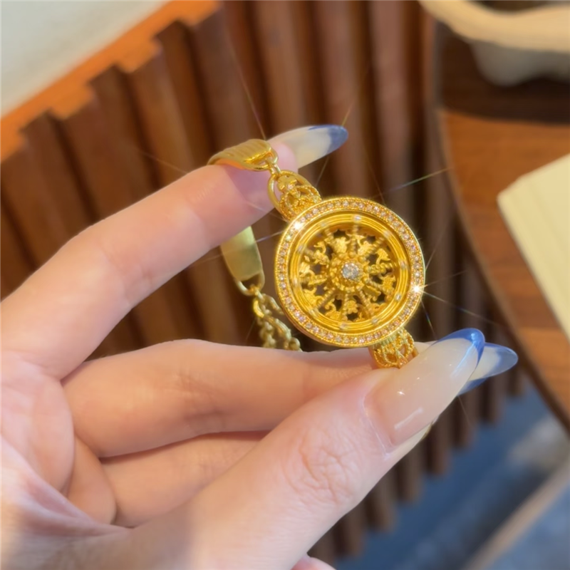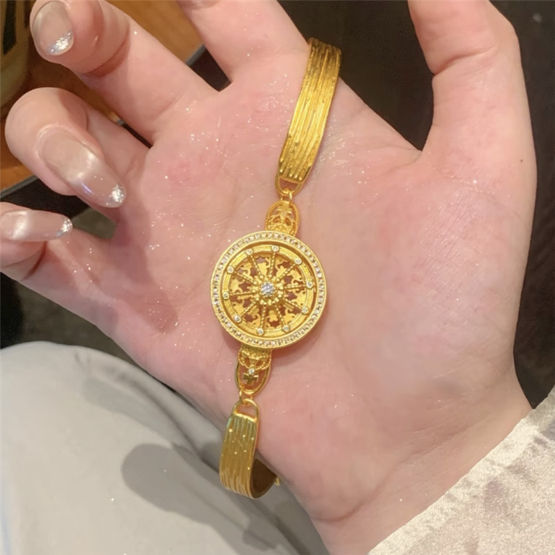 📚 古法沙金点钻镂空可转动皇冠马车罗盘手链女款圆盘星轮表带手饰品