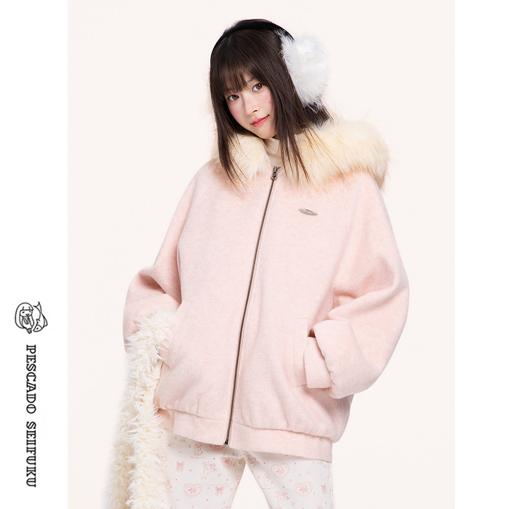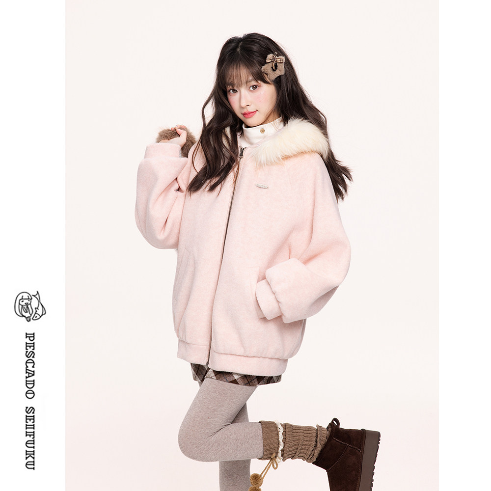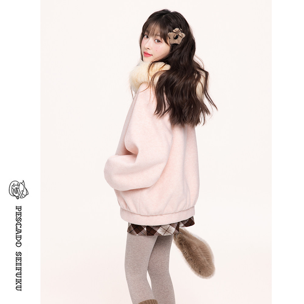 📚 甜鱼少盐[莓可]新年粉色短款大衣女加厚冬季款小个子羊毛毛呢外套