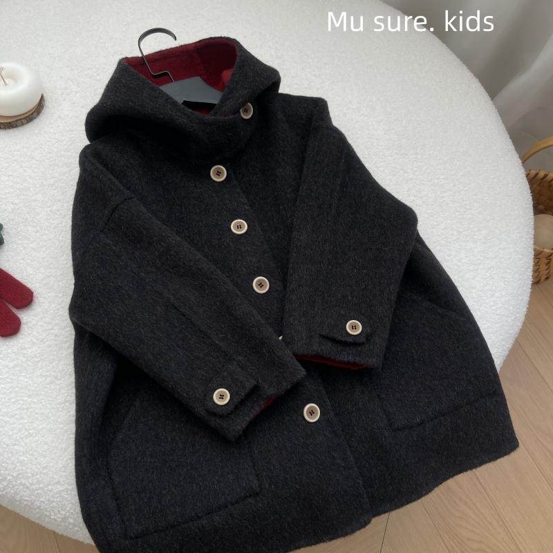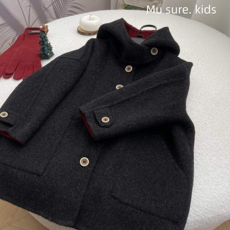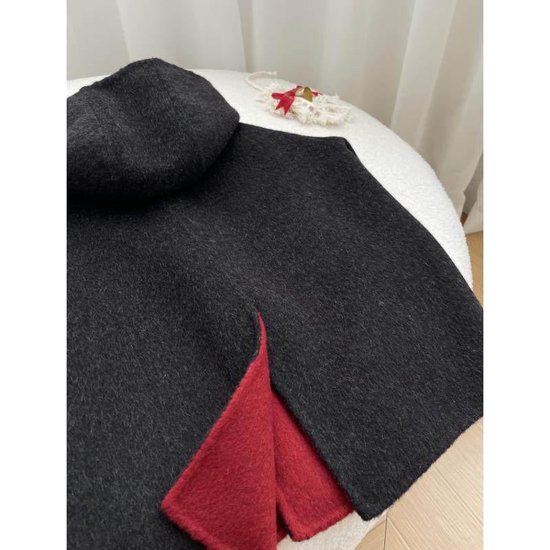 📚 黑红连帽青少年秋冬男童女童双面羊绒大衣羊毛呢中长款亲子款外套