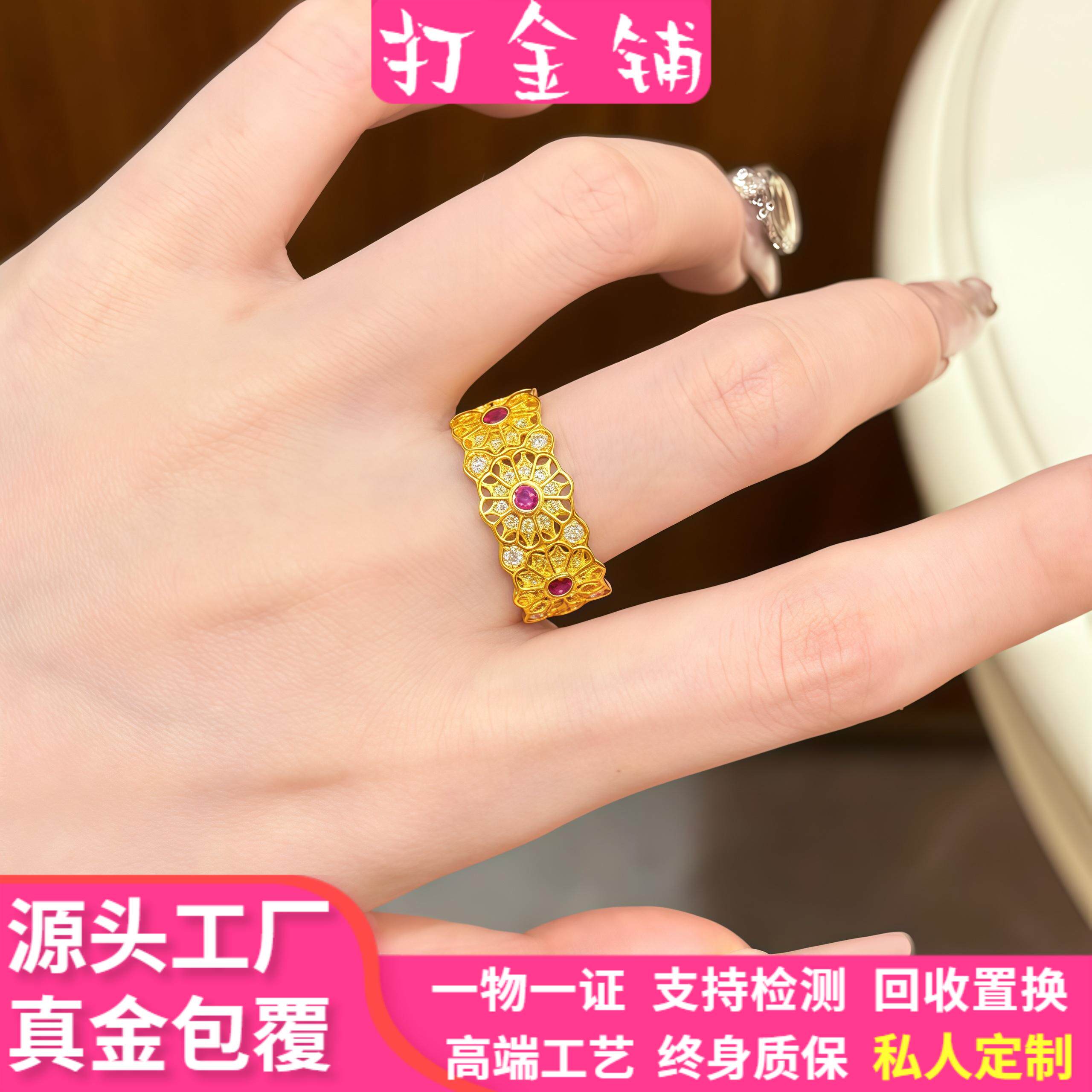 📚 古法金包银玫瑰花窗戒指女镂空太阳花丝指环镶钻素圈食指戒送礼物