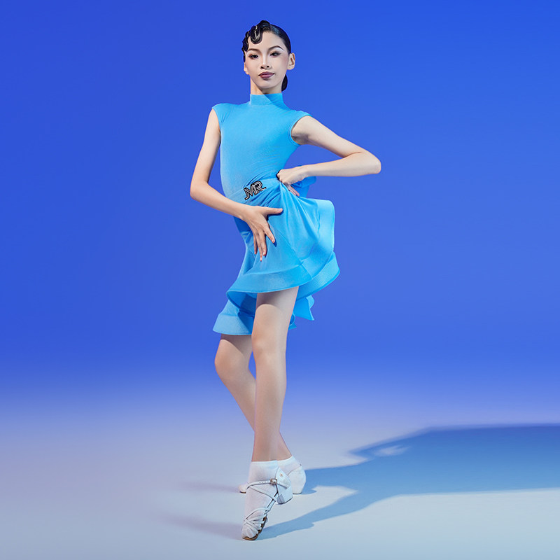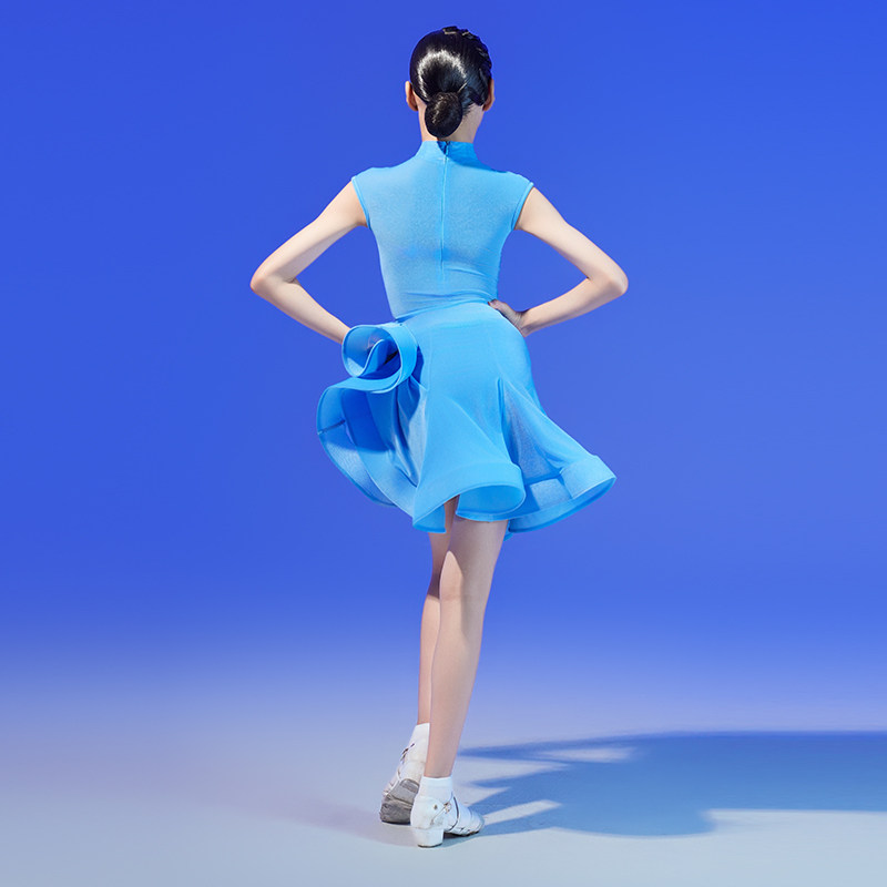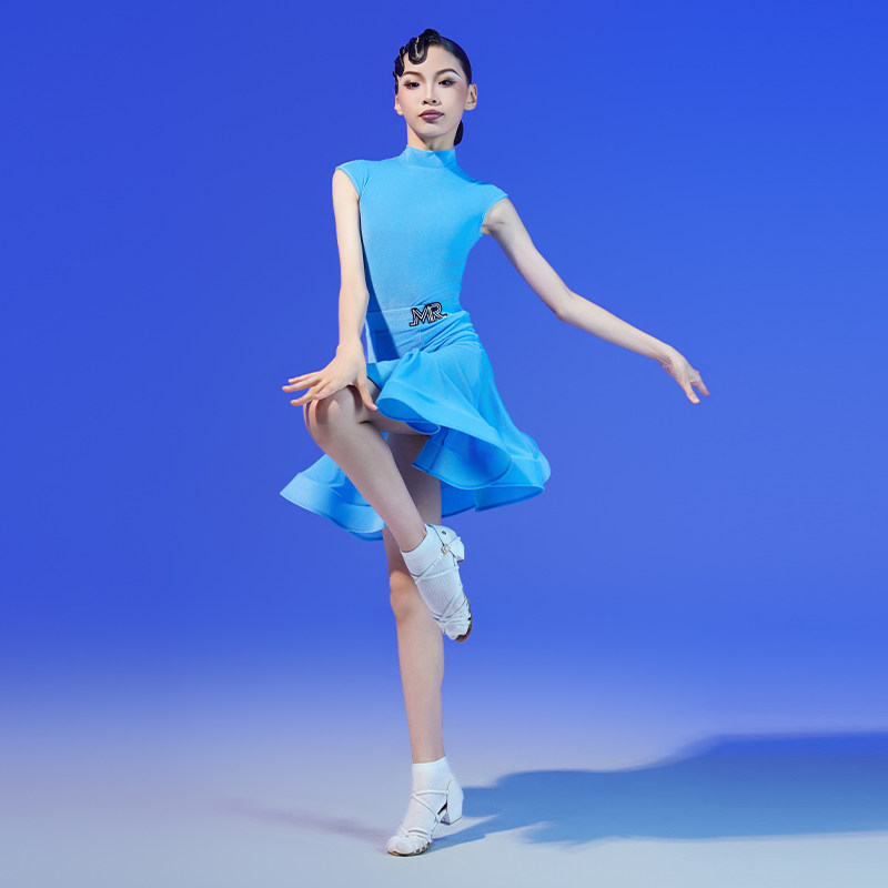 📚 MR舞服FZS少儿拉丁舞女半高领连肩短袖丝绒比赛服 蓝色规定服