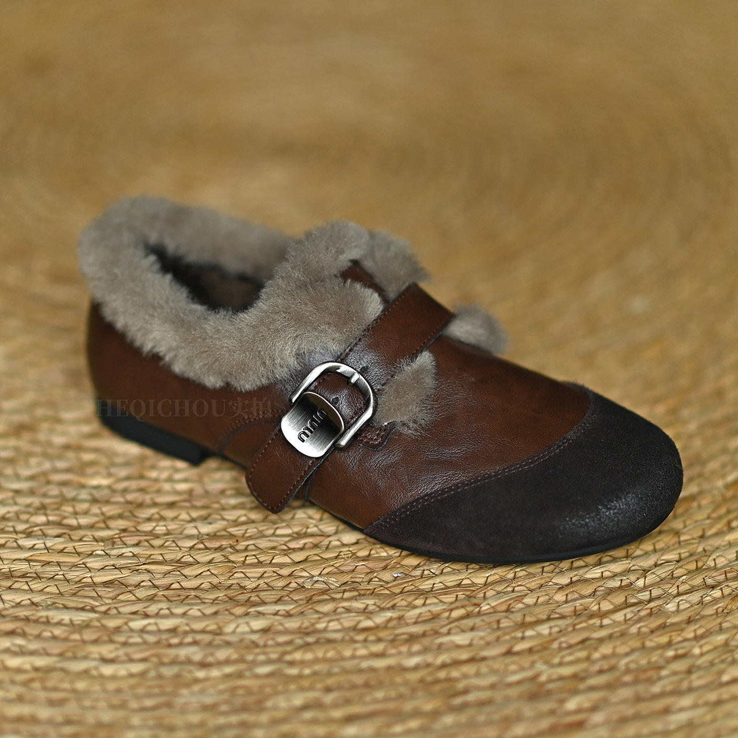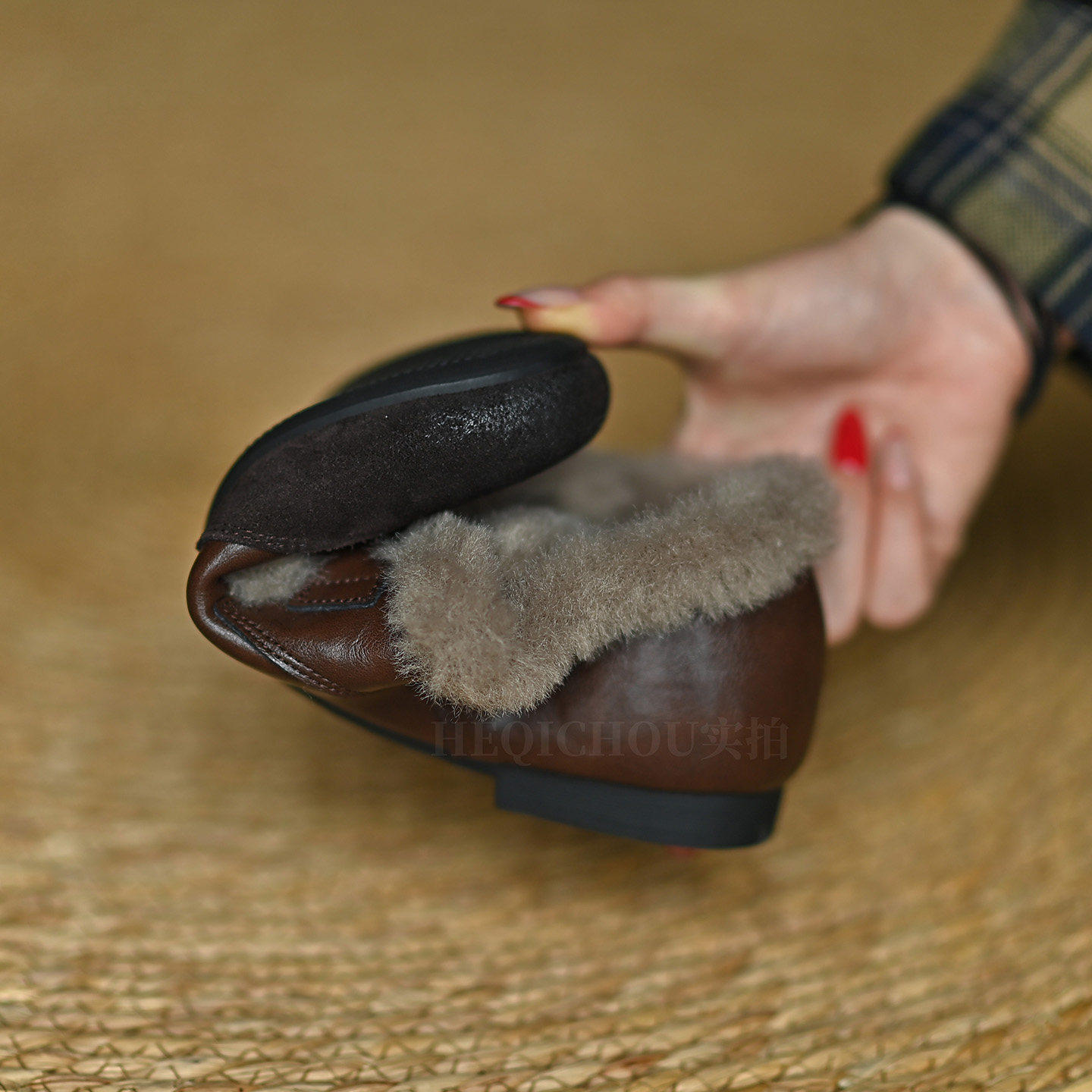 📚 何其丑超软牛皮保暖加绒单鞋女冬季新款真皮软底乐福鞋毛毛平底鞋