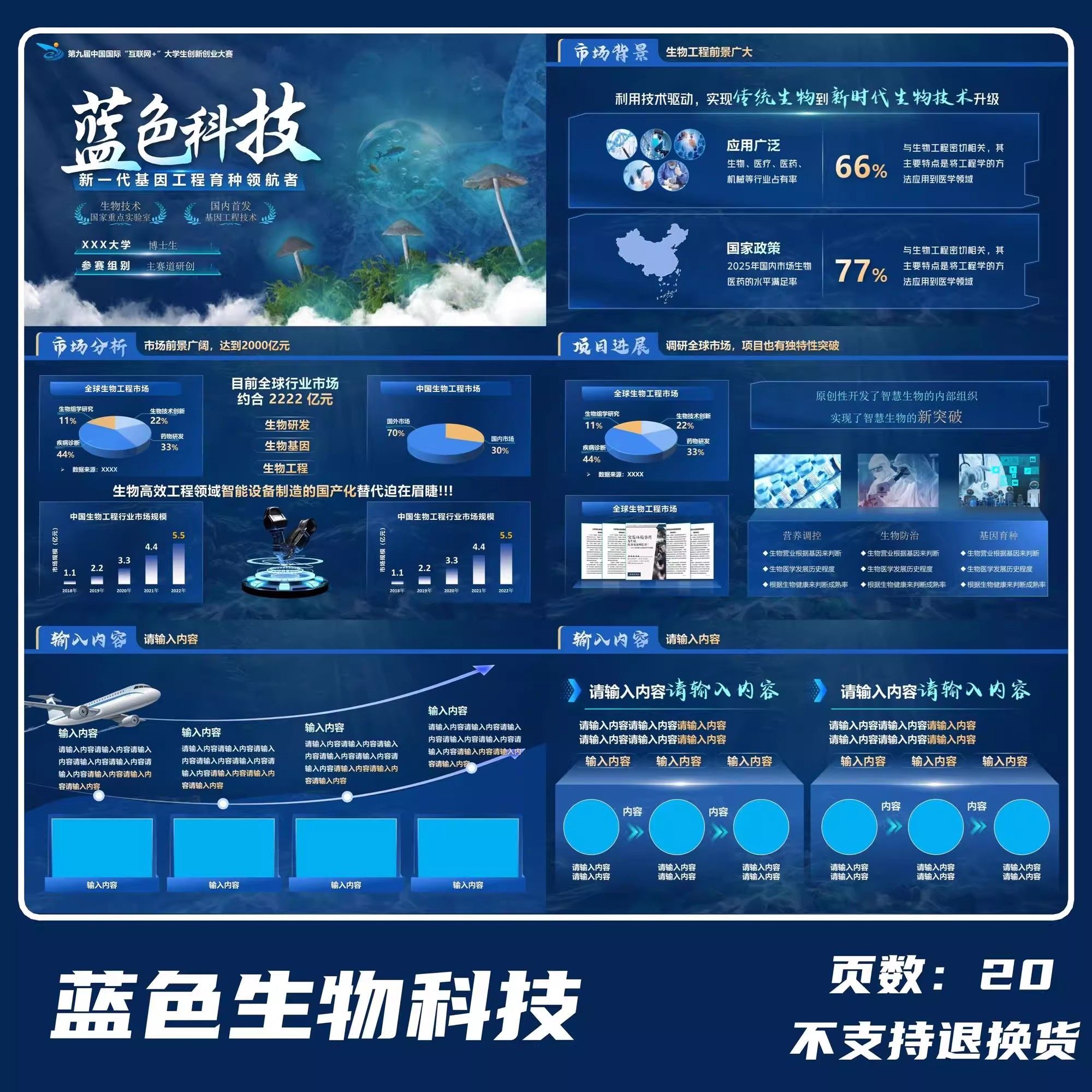 📚 20页蓝色生物科技风格国金创赛PPT模板互联网+挑战杯职业技能大赛